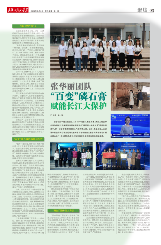 此前,该新闻作品荣获湖北省高校新闻奖通讯与深度报道类一等奖。报道围绕长江大保护背景下磷石膏综合治理、湖北产业升级转型的宏观层面,对团队“磷石膏一体化处置项目”的技术路线、创新之处及市场价值进行了深入解读,以团队科研和“双创”协同育人的经验方法和育人成果为落脚点,是一篇兼具科普性和人文性的深度报道。报道彰显了武汉工程大学在湖北省加快建成中部地区崛起重要战略支点的进程中,坚定不移地锚定“磷化工第一高校”建设目标,通过科技创新、人才培养和产教融合,为湖北支点建设注入强劲动能。