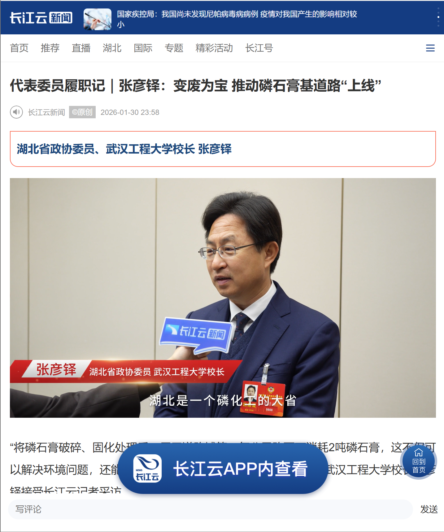 “将磷石膏破碎、固化处理后,用于道路铺筑,每公里路面可消耗2吨磷石膏,这不仅可以解决环境问题,还能变废为宝。”1月30日,湖北省政协委员、武汉工程大学校长张彦铎接受长江云记者采访。