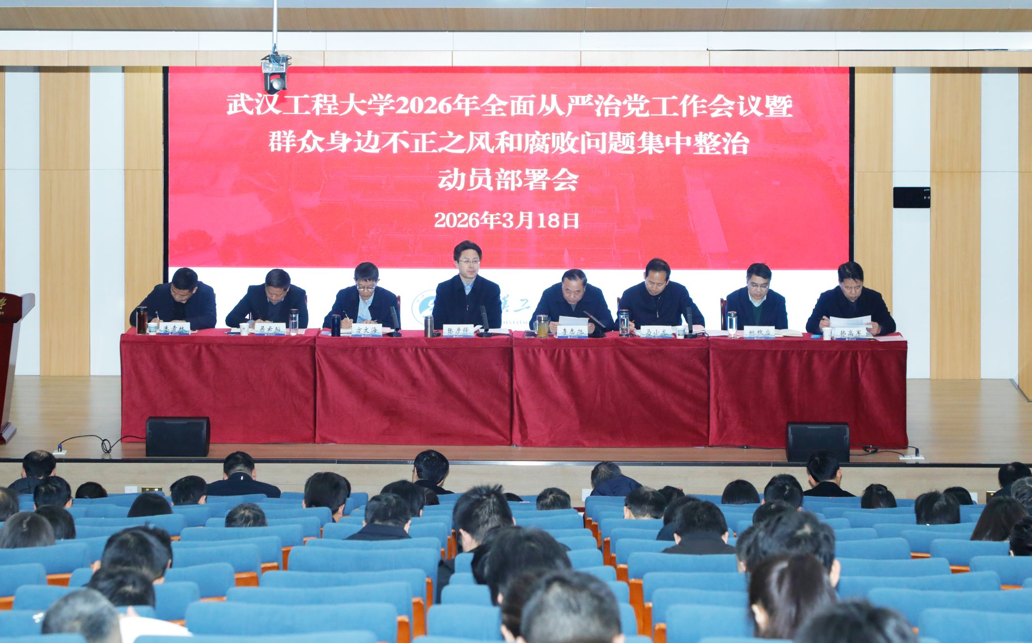 本网讯(通讯员 王祥礼 田明华 翟自强)3月18日下午,学校在教育教学综合楼102报告厅召开2026年全面从严治党工作会议暨群众身边不正之风和腐败问题集中整治动员部署会,校党委副书记、校长张彦铎主持会议并讲话,校党委副书记李志旭,校纪委书记方文海,校党委常委、副校长马小龙、吴云韬,副校长姚槐应,副校级干部朱青林,校党委常委、宣传部部长韩高军出席会议。