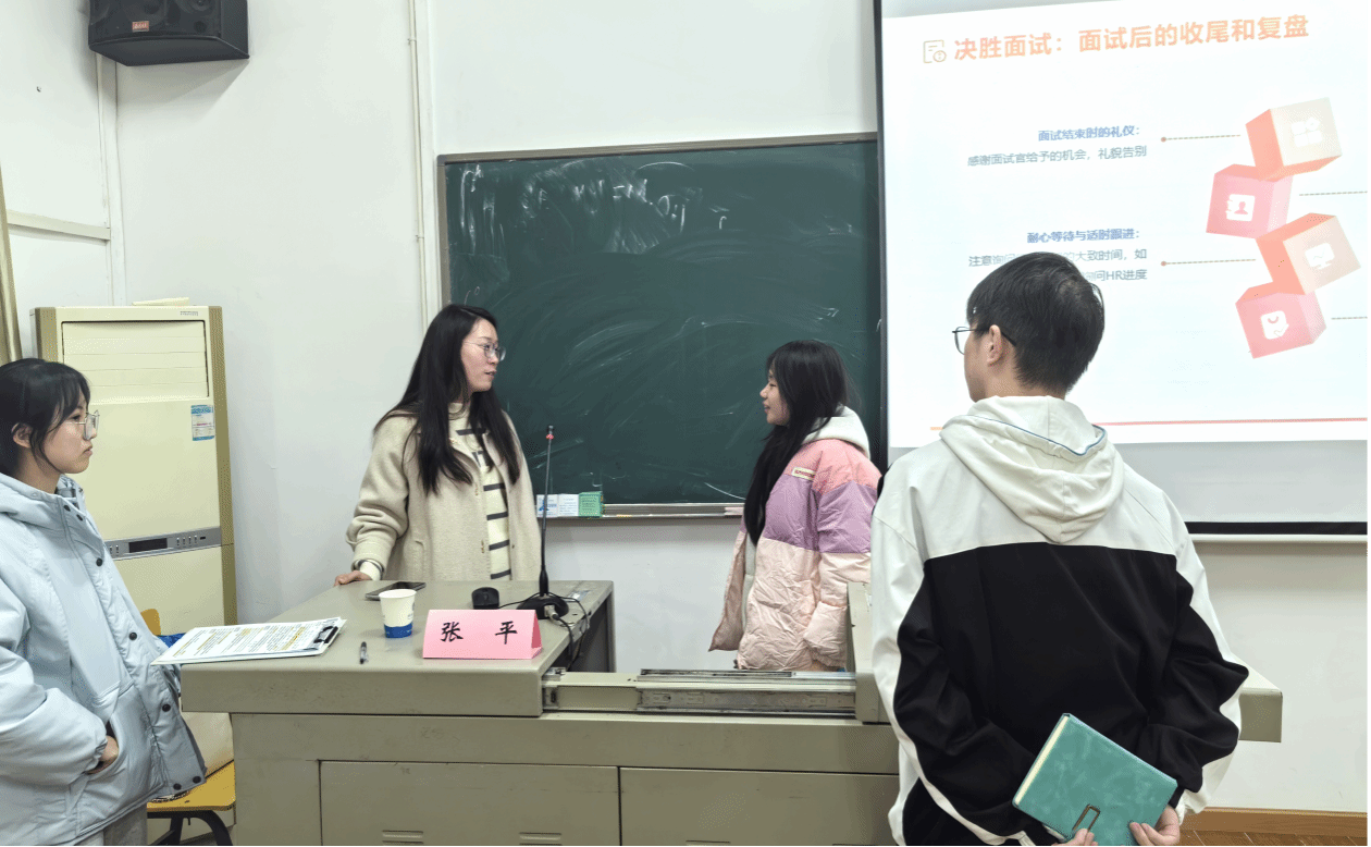 张平老师首先深入剖析了当前央国企的就业形势与政策背景,系统梳理了央国企的分类体系、最新名录及发展特点,并结合实际案例解析其人才需求趋势与职业发展优势,引导学生立足宏观环境,科学评估自身条件,打破信息壁垒,实现职业规划的精准定位。针对央国企招聘环节多、周期长的特点,张平老师重点拆解了从网申、笔试到面试的完整求职链条。她详细讲解了如何高效梳理关键时间节点、打造与岗位高度匹配的专业简历,并分享了笔试常考题型、面试常见问题及应对策略,帮助学生构建清晰的备考路线图与应聘行动计划。最后,,在交流环节,同学们围绕“职业发展通道”“实习经历挖掘”等实际问题踊跃提问。张平老师结合自身丰富的行业经验与案例,给予了细致解答和具体建议,为学子们提供了切实可行的行动参考。