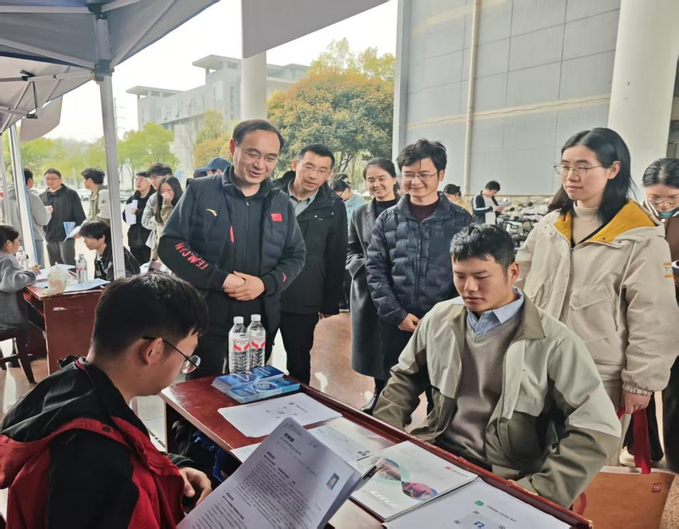 刘念一行到招聘前台查看公司简介、岗位要求和毕业生简历投递、面试情况,了解用人单位招聘需求,与企业负责人和同学们亲切交流。
