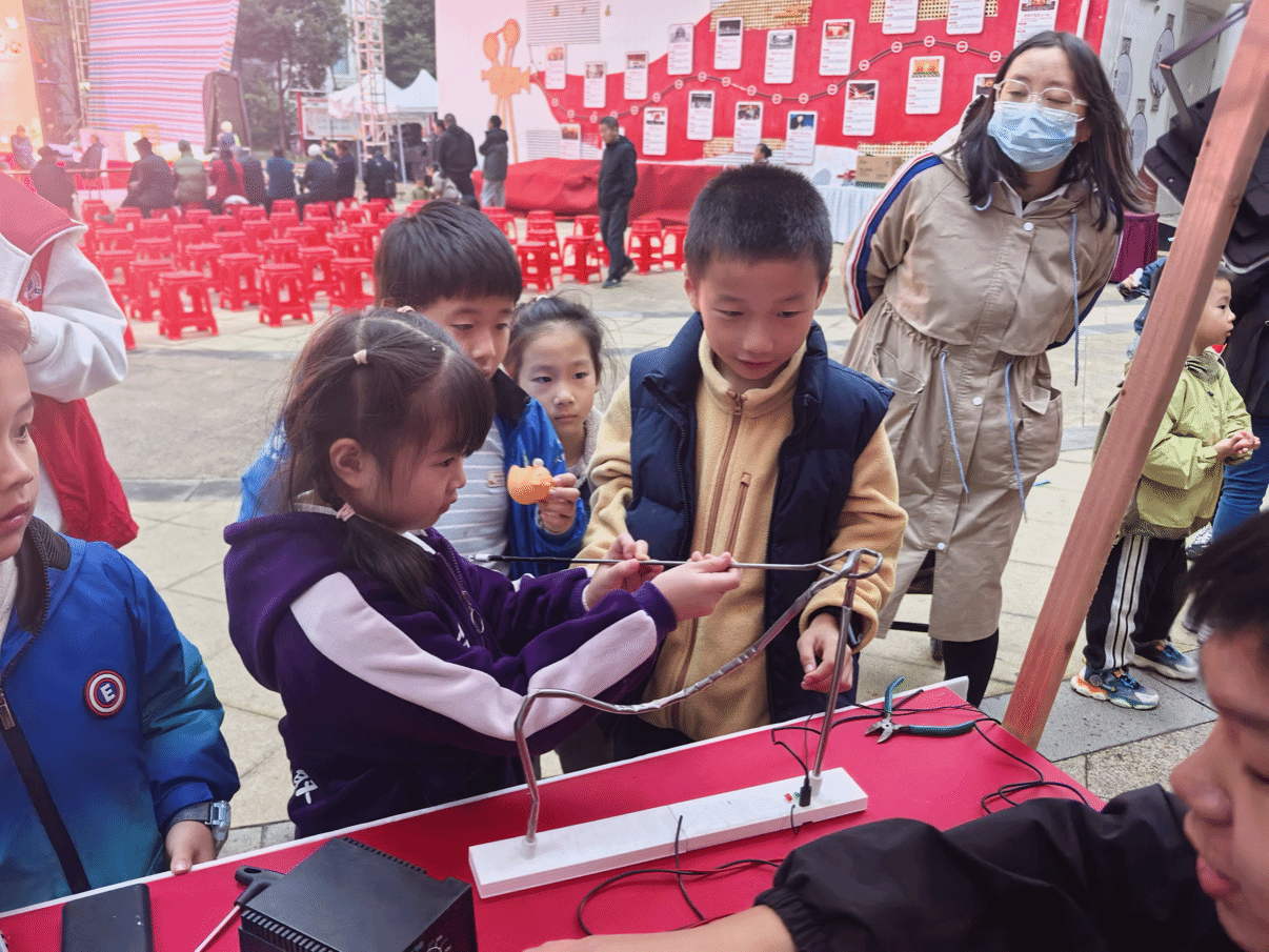 电器维修点摊位旁专门设置了智趣游戏区,吸引了众多儿童的参与。游戏道具为一根造型曲折的金属轨道与配套环形操作杆,规则简单却极具挑战性。孩子们兴致勃勃地排队尝试,失败了就总结经验重新挑战,成功后则兴奋地与同伴分享喜悦,志愿者也不时上前给予指导,整个游戏区充满了欢声笑语。