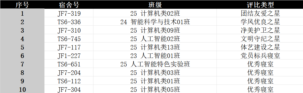 最终共有5间宿舍成功评为“五星标兵寝室”;1间宿舍成功评为“党员标兵寝室”;4间宿舍评为“优秀寝室”。
