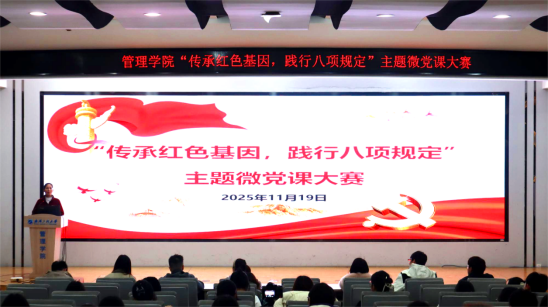 本网讯(通讯员 李梓煜)11月19日下午,管理学院在文科楼413报告厅举办“传承红色基因,践行八项规定”主题微党课大赛。学院党委书记左辉、副书记罗琼、各党支部书记、学生党员代表、第18期发展对象培训班全体学员参加活动。