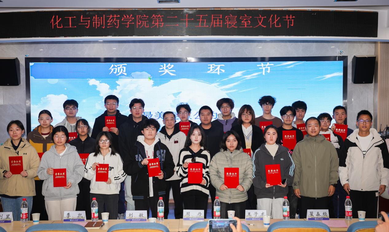本网讯(通讯员 张列罡)11月24日,化工与制药学院在化工大楼610报告厅成功举办第25届寝室文化节决赛暨“最美宿舍公约”获奖寝室颁奖仪式。化药学院党委副书记周丹,党委学工部、武装部副主任科员刘敏、校团委科创部部长季凯、党委保卫部王子龙,化药学院辅导员翟森稳、张列罡担任评委,现场110余名化药学子参加活动,共同见证寝室风采与榜样力量。