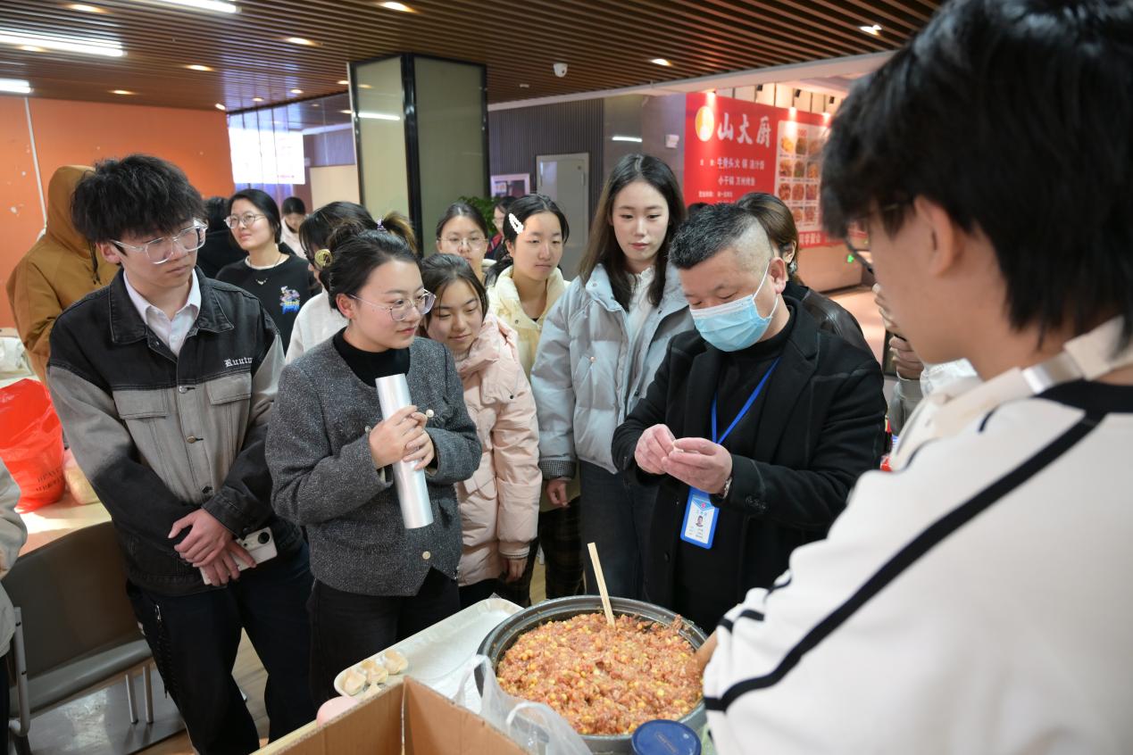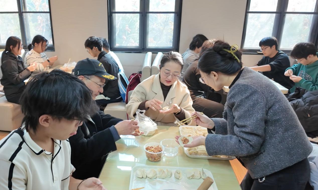 在领取了手套、擀面杖等工具和准备好的饺子皮、馅料后,活动正式进入实践环节。师生们自由组合,分工协作。院领导及教师们也融入同学们中间,一边娴熟地包着饺子,一边与大家亲切交谈,关心询问同学们近期的学习和生活情况。