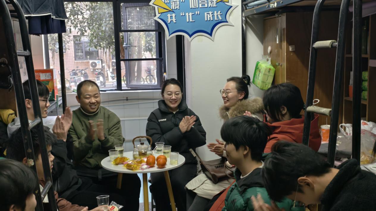 本网讯(通讯员 张列罡)2026年1月9日,由化工与制药学院团委主办,本科化工第二党支部承办的“寝”心答疑、共“化”成长师生茶话会(第二期)活动在泰塑2-110宿舍顺利开展。学院辅导员,“化育启思”工作室成员张列罡、文静和刘悦薇,许志伟志愿服务队主负责人赖闽韬,2025级本科能源化学工程02班副班主任张诗雨邀请该班部分同学齐聚一堂、共话成长。活动由负责人张列罡主持。