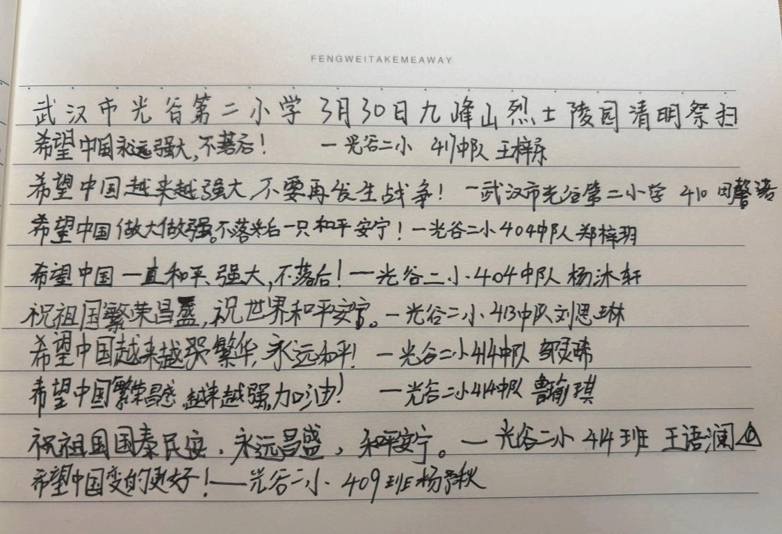 祭拜活动结束后,光谷二小的同学们纷纷拿出纸笔,认真写下此次清明祭扫的感悟。孩子们低头伏案,一笔一划写得格外认真,稚嫩的笔尖流淌出最真挚的情感,一字一句,皆是内心的触动;一言一语,尽显精神的洗礼,孩子们脸上认真的神情、笔下真诚的文字,无不印证着此次思政教育的圆满成功,英烈精神已然在孩子们心中种下了红色的种子,悄然生根发芽,也让 “拾光计划” 的红色育人力量,在一代又一代青少年心中传递延续。