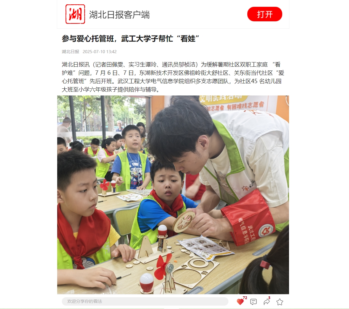 湖北日报讯(记者田佩雯、实习生谭玲、通讯员邬桢洁)为缓解暑期社区双职工家庭 “看护难”问题,7 月 6 日、7 日,东湖新技术开发区佛祖岭街大舒社区、关东街当代社区“爱心托管班”先后开班。武汉工程大学电气信息学院组织多支志愿团队,为社区45 名幼儿园大班至小学六年级孩子提供陪伴与辅导。