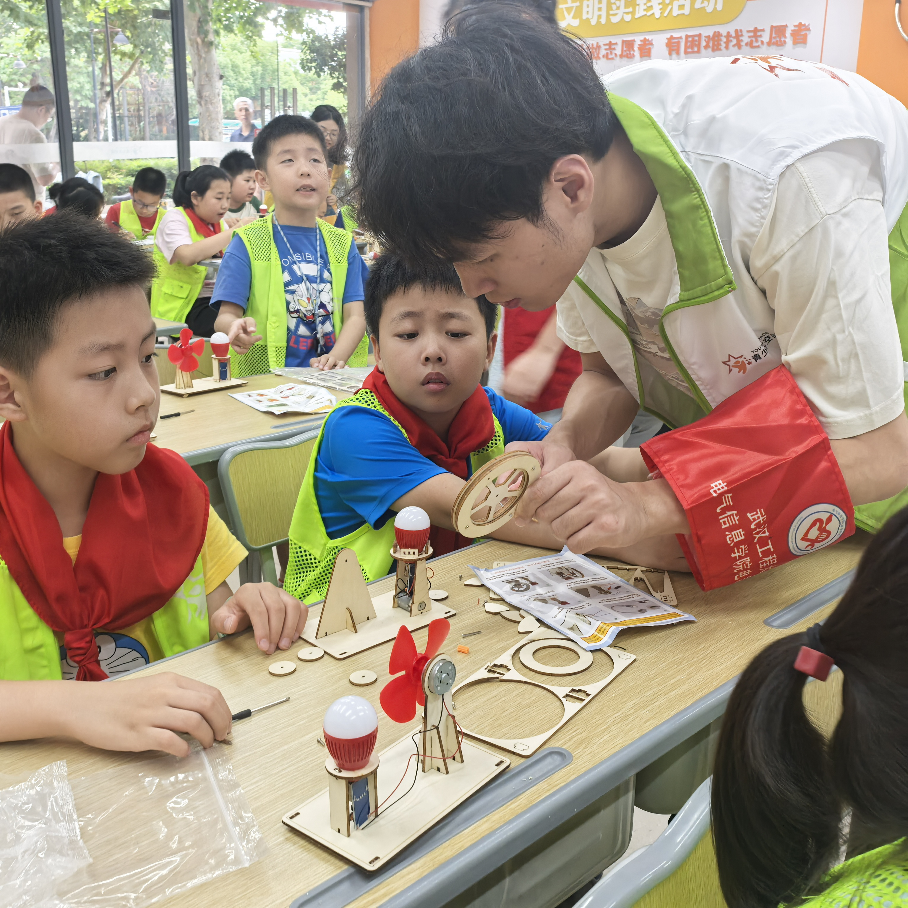 武汉工程大学电气信息学院电维安芯童伴志愿服务团带来《电的奇妙旅行:从发电站到我家》科普课,志愿者们通过 PPT 课件,结合生动讲解和趣味实验,让孩子们了解电力知识;该院 “知音汇” 团队的非遗绒花课备受孩子们喜爱,志愿者先讲解绒花的历史和制作方法,再一步步指导孩子们动手制作,孩子们兴致勃勃地跟着学习,一朵朵稚嫩可爱的绒花在他们手中“绽放”。