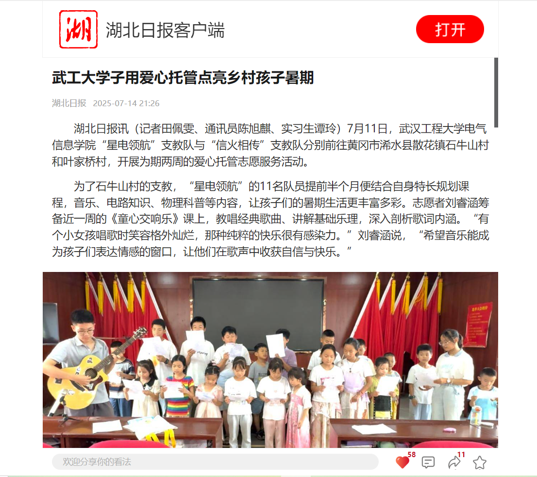 湖北日报讯(记者田佩雯、通讯员陈旭麒、实习生谭玲)7月11日,武汉工程大学电气信息学院“星电领航”支教队与“信火相传”支教队分别前往黄冈市浠水县散花镇石牛山村和叶家桥村,开展为期两周的爱心托管志愿服务活动。