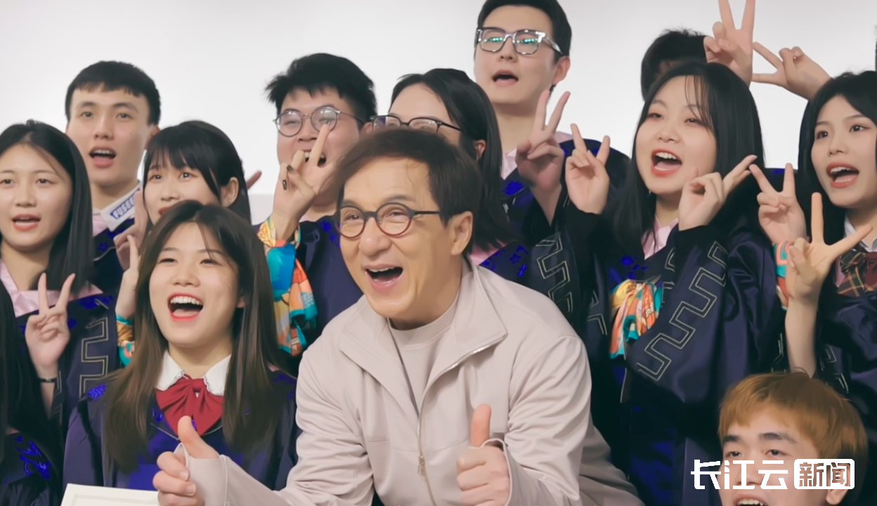 成龙影视传媒学院院长成龙与学生们在一起。