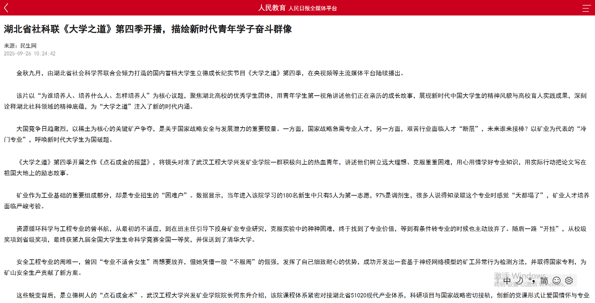 这些蜕变背后,是立德树人的“点石成金术”。武汉工程大学兴发矿业学院院长何东升介绍,该院课程体系紧密对接湖北省51020现代产业体系,科研项目与国家战略密切接轨,创新的党课形式让爱国情怀与专业自豪感在学生心中扎根……