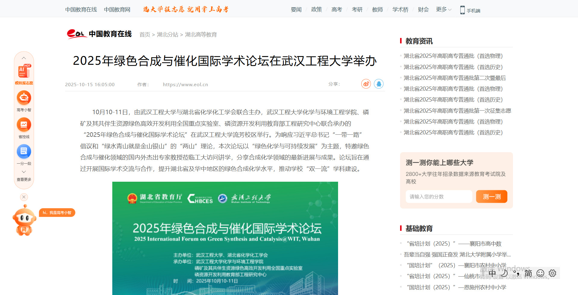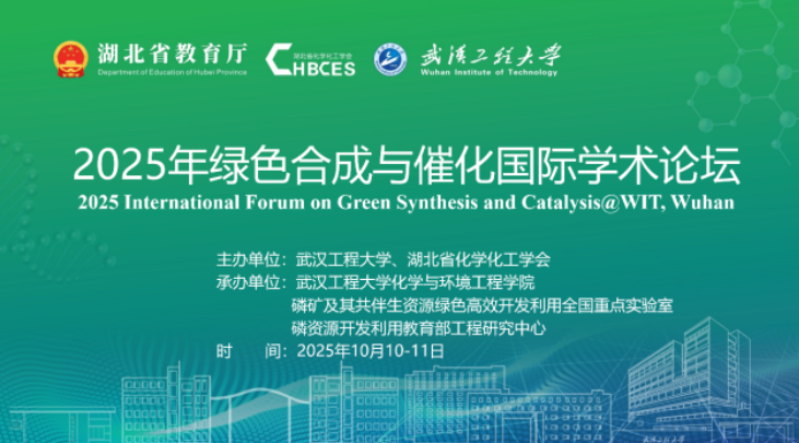 10月10-11日,由武汉工程大学与湖北省化学化工学会联合主办,武汉工程大学化学与环境工程学院、磷矿及其共伴生资源绿色高效开发利用全国重点实验室、磷资源开发利用教育部工程研究中心联合承办的“2025年绿色合成与催化国际学术论坛”在武汉工程大学流芳校区举行。为响应习近平总书记“一带一路”倡议和“绿水青山就是金山银山”的“两山”理论,本次论坛以“绿色化学与可持续发展”为主题,特邀绿色合成与催化领域的国内外杰出专家教授莅临工大访问讲学,分享合成化学领域的最新进展与成果。论坛旨在通过开展国际学术交流与合作,提升湖北省及华中地区的绿色合成化学水平,推动学校“双一流”学科建设。