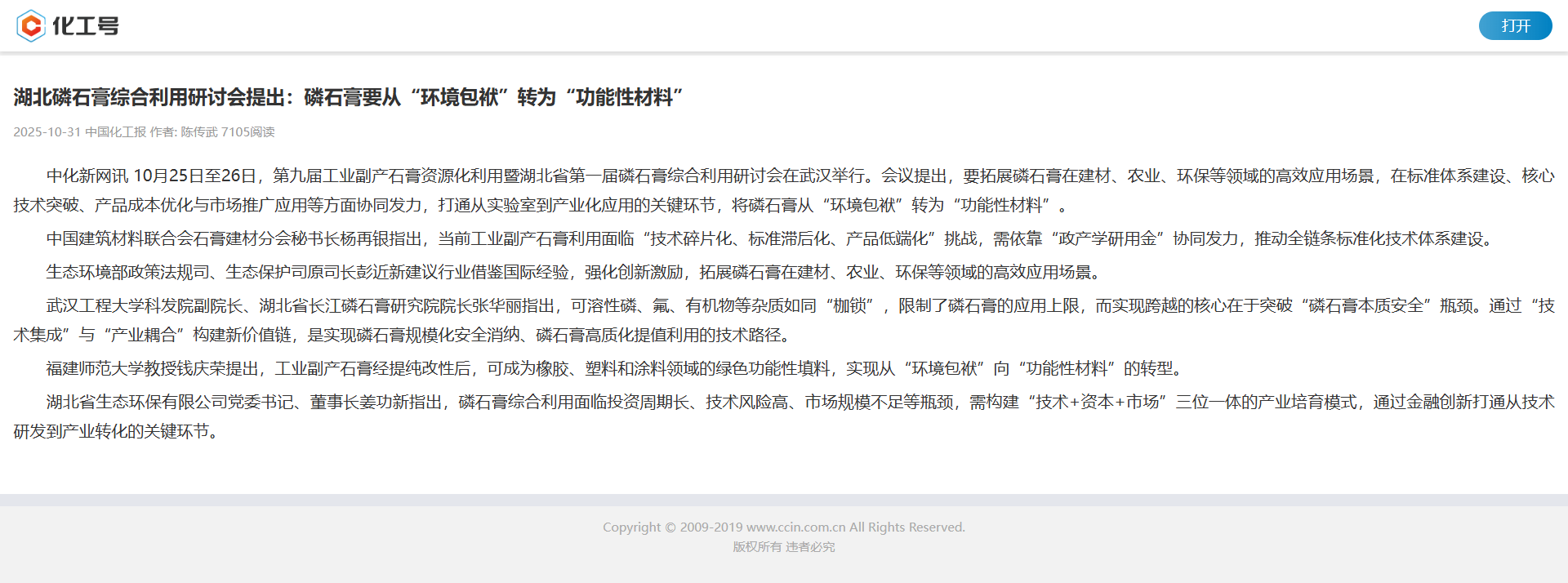 中化新网讯 10月25日至26日,第九届工业副产石膏资源化利用暨湖北省第一届磷石膏综合利用研讨会在武汉举行。会议提出,要拓展磷石膏在建材、农业、环保等领域的高效应用场景,在标准体系建设、核心技术突破、产品成本优化与市场推广应用等方面协同发力,打通从实验室到产业化应用的关键环节,将磷石膏从“环境包袱”转为“功能性材料”。