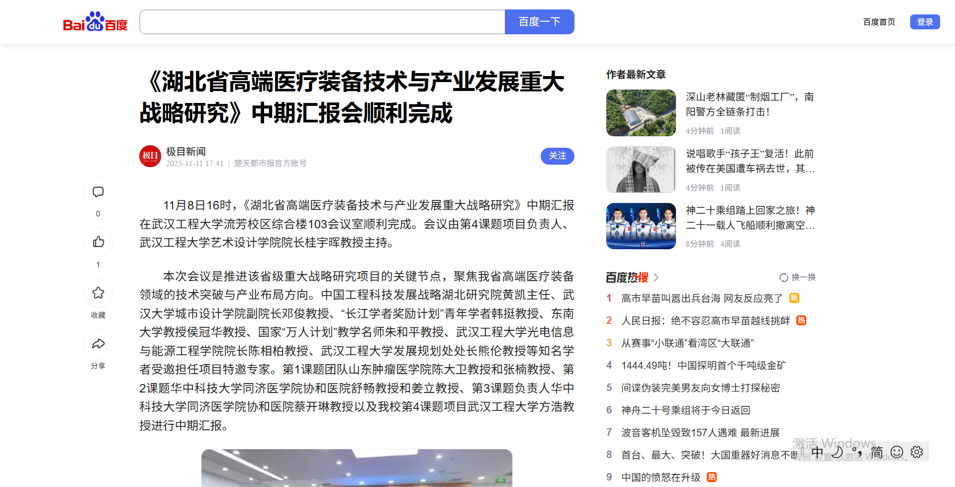 该项目《湖北省高端医疗装备产业发展研究》是于金明院士、陈孝平院士团队牵头,响应国家“卡脖子”技术攻坚需求。依托国家及湖北等地AI+医疗政策,分析国际高端医疗企业格局与国内学术研究趋势,构建动态报告发布、全民医疗档案等技术路线,破解AI分析幻觉难题。其中课题获省领导批示,相关研究被纳入省政协提案立案,助力医疗装备产业升级,并且在本次中期汇报进程中。