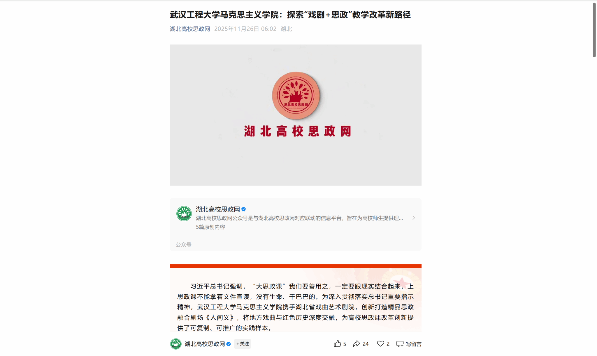 习近平总书记强调,“大思政课”我们要善用之,一定要跟现实结合起来,上思政课不能拿着文件宣读,没有生命、干巴巴的。为深入贯彻落实总书记重要指示精神,武汉工程大学马克思主义学院携手湖北省戏曲艺术剧院,创新打造精品思政融合剧场《人间义》,将地方戏曲与红色历史深度交融,为高校思政课改革创新提供了可复制、可推广的实践样本。