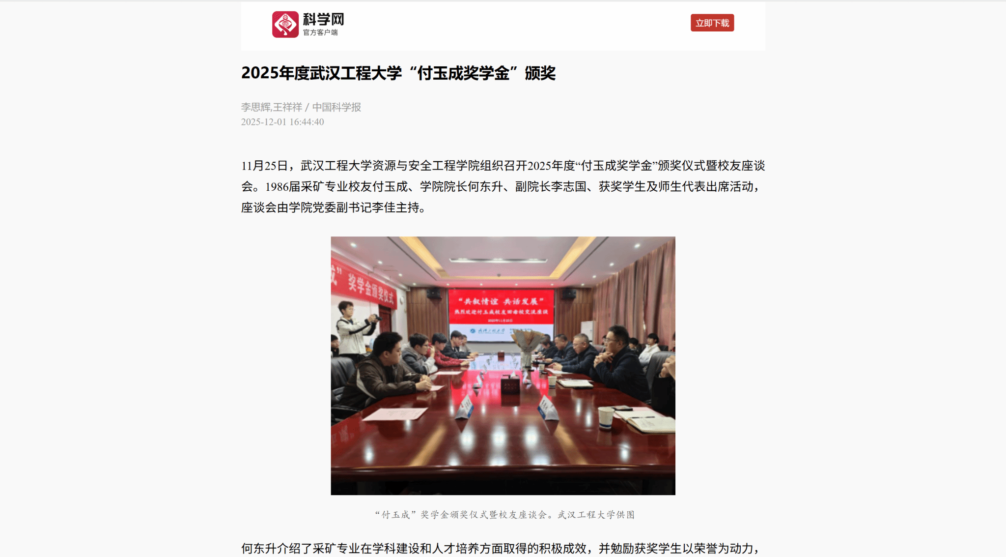 11月25日,武汉工程大学资源与安全工程学院组织召开2025年度“付玉成奖学金”颁奖仪式暨校友座谈会。1986届采矿专业校友付玉成、学院院长何东升、副院长李志国、获奖学生及师生代表出席活动,座谈会由学院党委副书记李佳主持。