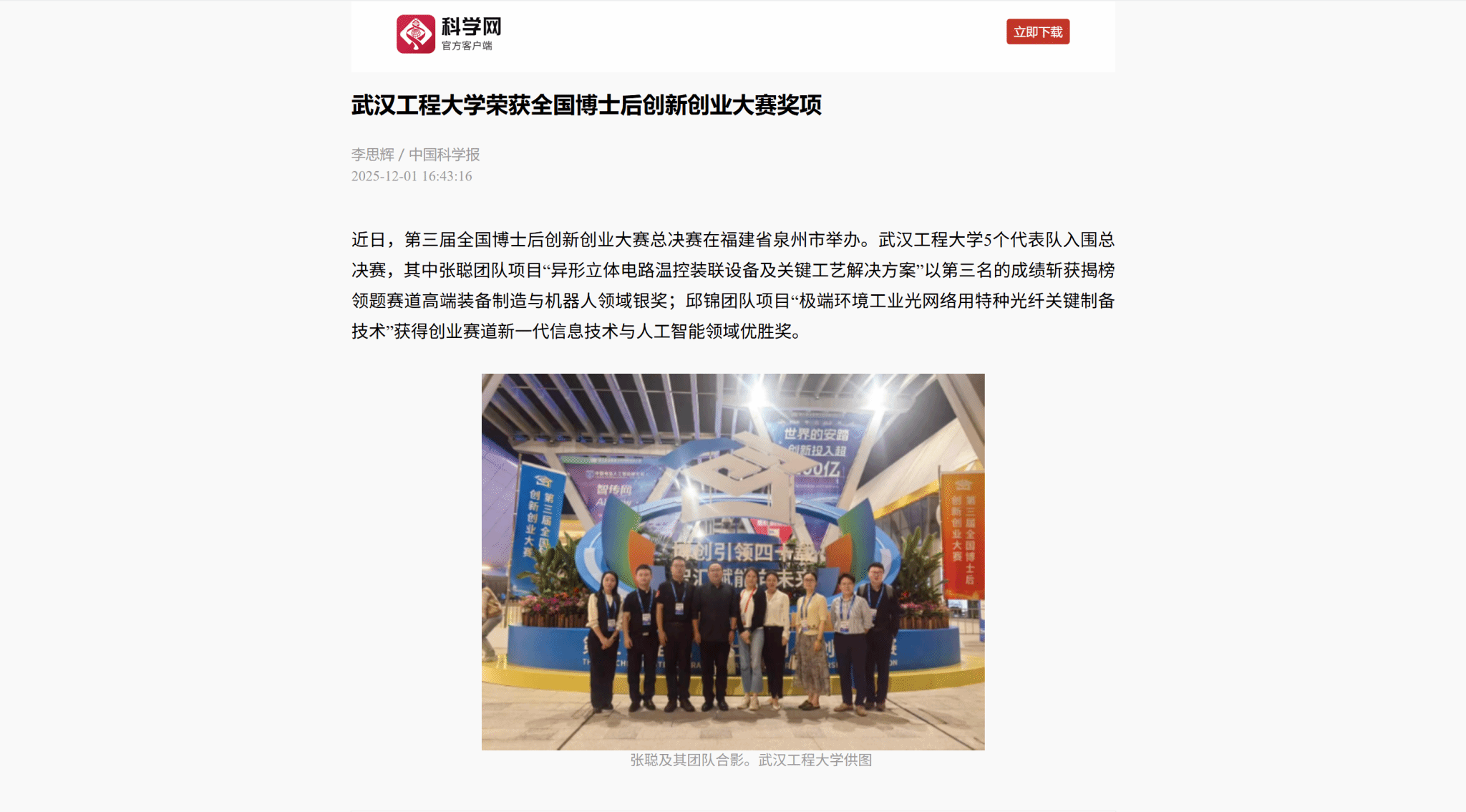 近日,第三届全国博士后创新创业大赛总决赛在福建省泉州市举办。武汉工程大学5个代表队入围总决赛,其中张聪团队项目“异形立体电路温控装联设备及关键工艺解决方案”以第三名的成绩斩获揭榜领题赛道高端装备制造与机器人领域银奖;邱锦团队项目“极端环境工业光网络用特种光纤关键制备技术”获得创业赛道新一代信息技术与人工智能领域优胜奖。