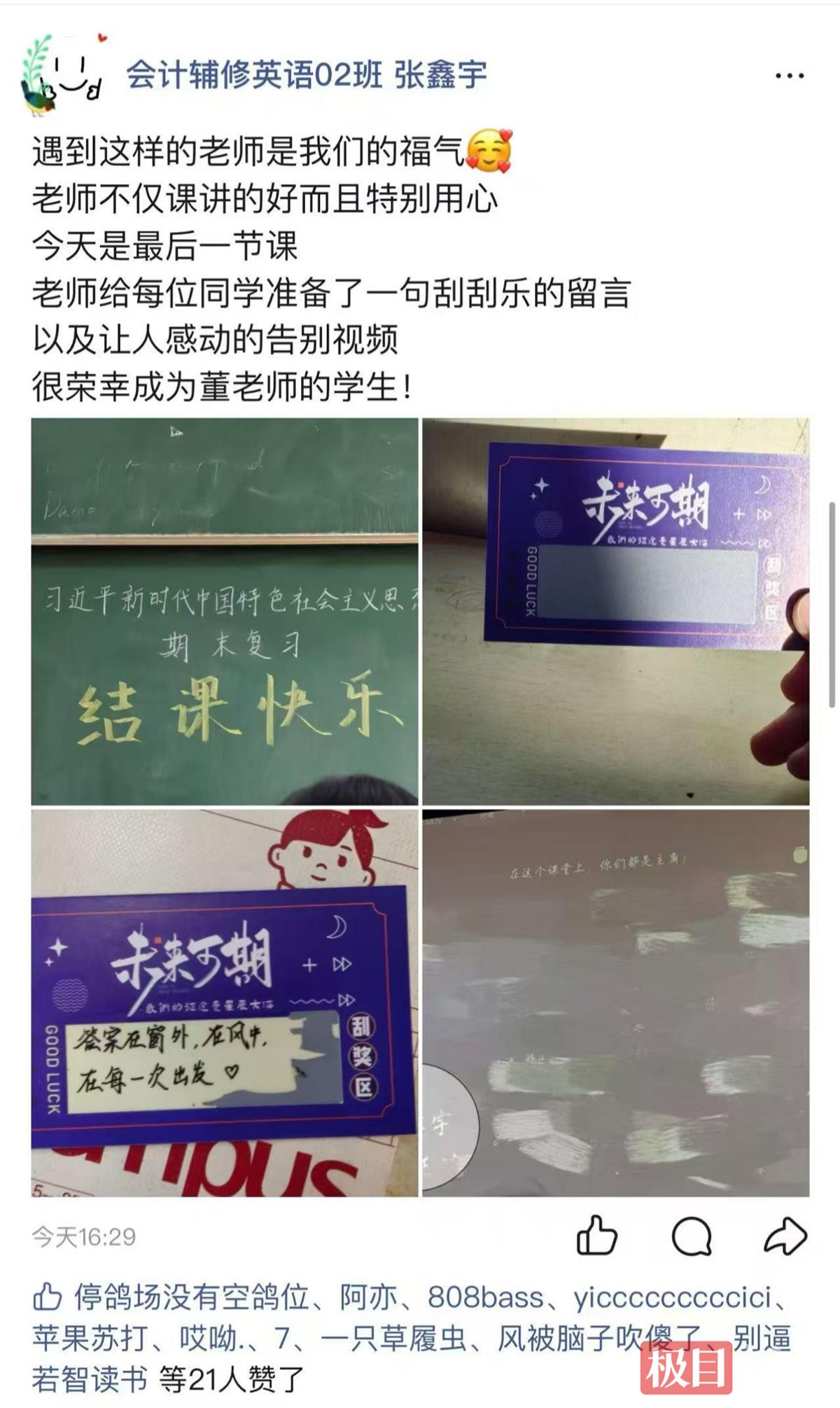 “最特别的结课礼物”“很荣幸能成为董老师的学生……”大家纷纷举起刮刮卡拍照、上传朋友圈。“没有想到会在结课的时候收到这样一份礼物,董老师超级用心,我们很感动!”会计学2402班张鑫宇激动地说。