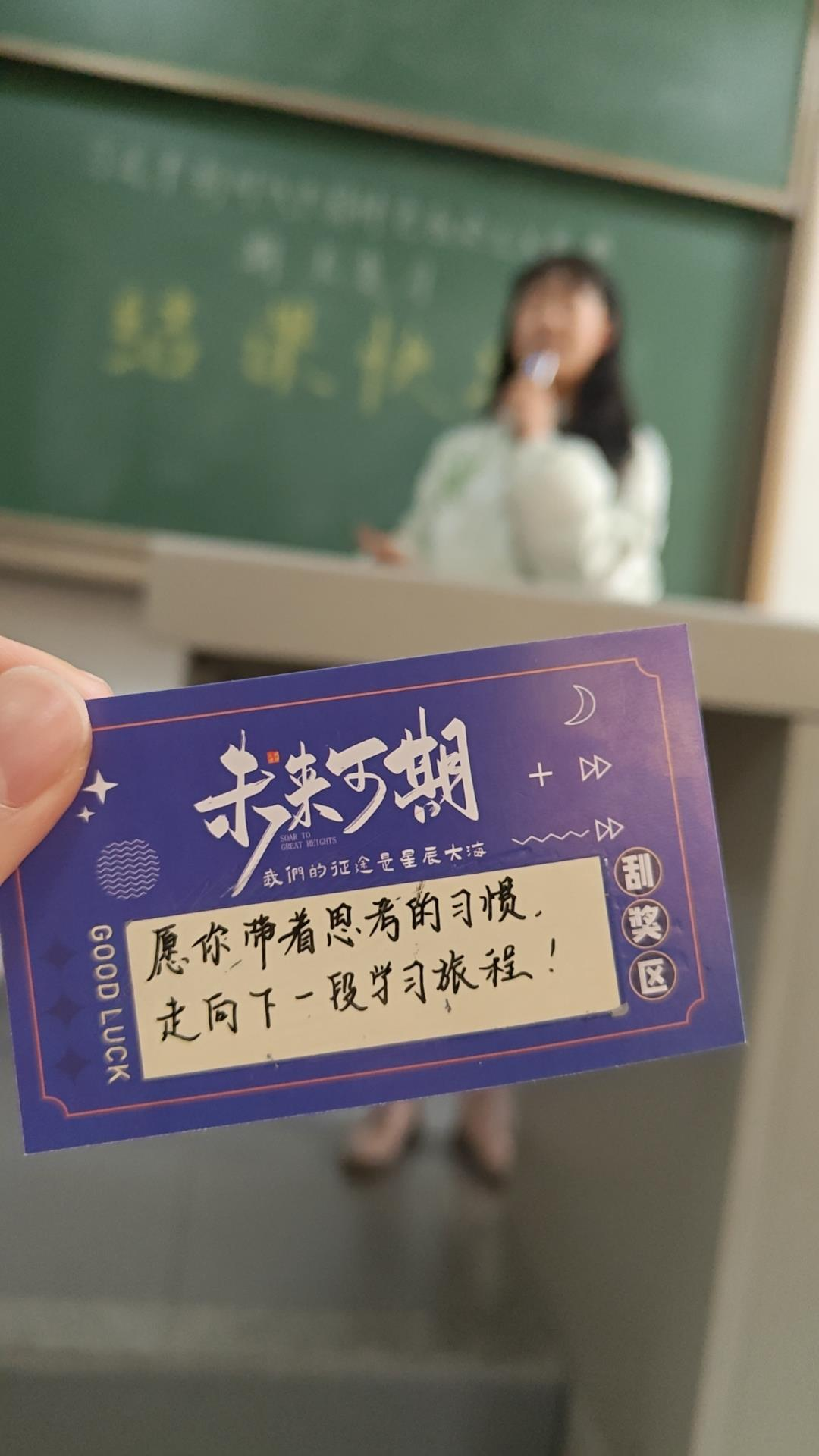 今年的结课仪式,灵感源于董苾茜陪伴6岁孩子的日常。“我平时会用刮刮卡激励孩子,写他想要的礼物或小梦想,达成目标就给他兑现,这次结课突然想到,学生们也会喜欢这种充满随机性的惊喜。”为了这份诚意,董老师提前半个月在网上订购刮刮卡,花两天时间逐张手写嘱咐和寄语,“写的内容尽量不重复,前后左右学生拿到的话不一样,才有意思、有激励性”。