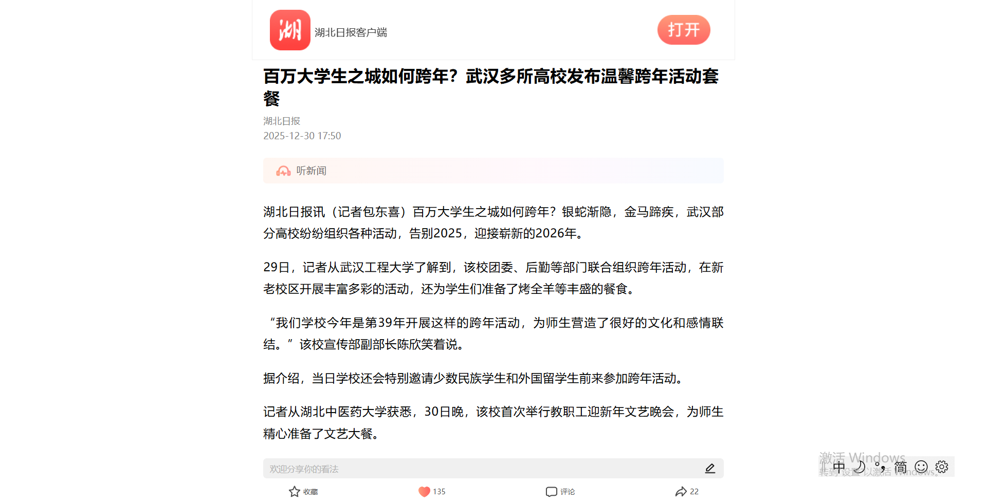 湖北日报讯(记者包东喜)百万大学生之城如何跨年?银蛇渐隐,金马蹄疾,武汉部分高校纷纷组织各种活动,告别2025,迎接崭新的2026年。
