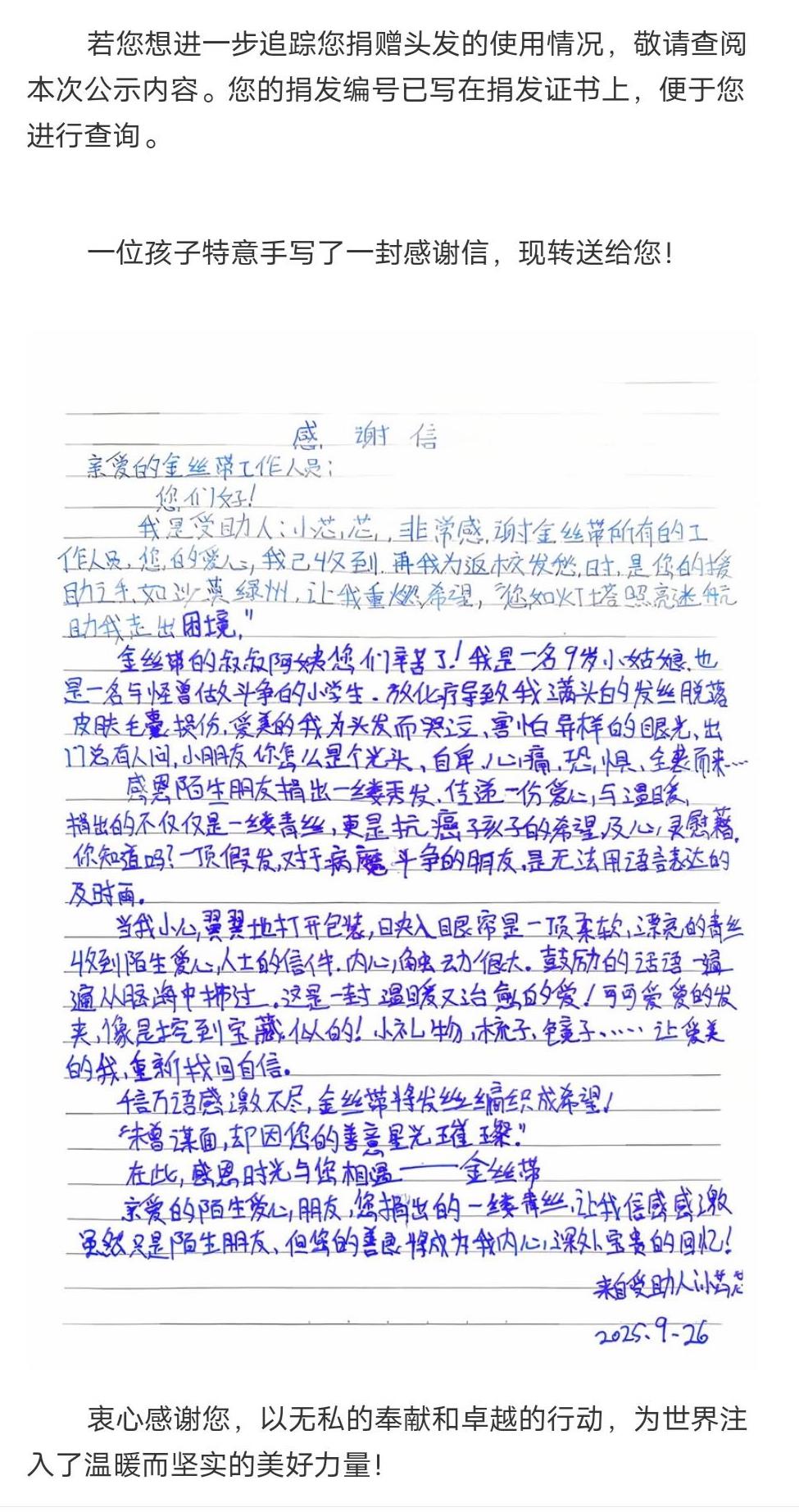 为坚守捐赠标准,她四年间从未进行过烫染,还坚持每天喝黑米粥养护发质,只为让捐赠的头发达到最佳状态。武汉的夏日闷热难耐,浓厚的长发裹着后背,时常让她汗湿衣襟。为了应对酷暑,罗雨欣练就了各式麻花辫编发技巧。2025年春节后,带着“云程发轫,风禾尽起。小朋友,加油!”的手写祝福,她将这束37厘米的长发寄出,成为广州金丝带“为爱发生”项目第50609位捐赠者。