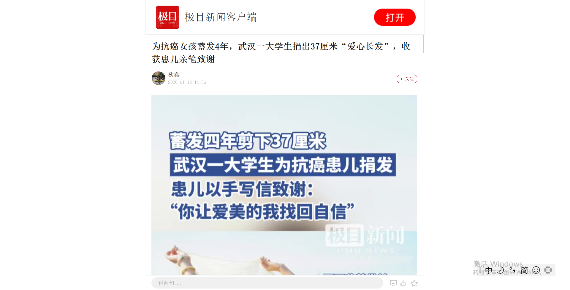 “我是一名与怪兽做斗争的小学生,放化疗让我失去了满头的发丝……你的小礼物,让爱美的我重新找回自信。”1月9日,极目新闻记者从武汉工程大学获悉,该校艺术设计学院2022级工业设计专业学生罗雨欣,收到了一封来自陌生孩子的亲笔感谢信。而这份温暖的联结,源于她2025年初的一次善举——将蓄养四年的37厘米无烫染长发,捐赠给抗癌儿童。