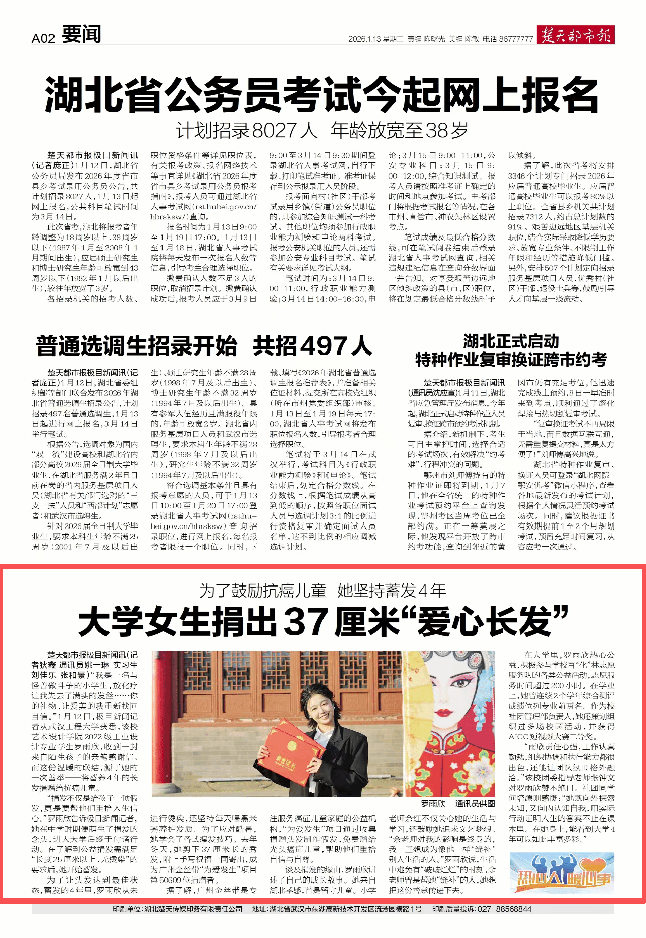 楚天都市报极目新闻讯(记者狄鑫 通讯员姚一琳 实习生刘佳乐 张和景)“我是一名与怪兽做斗争的小学生,放化疗让我失去了满头的发丝……你的礼物,让爱美的我重新找回自信。”1月12日,极目新闻记者从武汉工程大学获悉,该校设计艺术学院2022级设计专业学生罗雨欣,收到一封来自陌生孩子的亲笔感谢信。而这份温暖的联结,源于她的一次善举——将蓄养4年的长发捐赠给抗癌儿童。