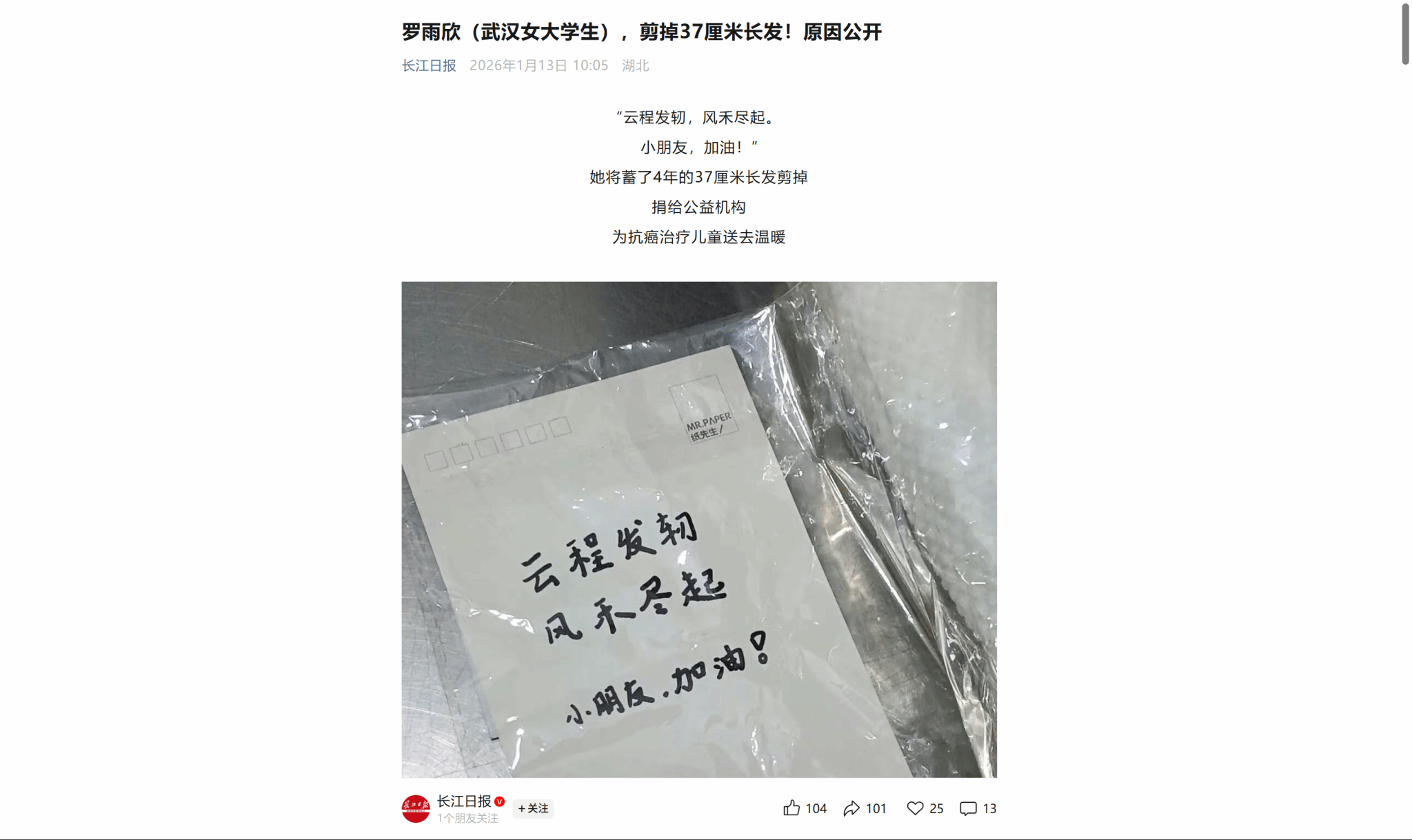 她还附上了“云程发轫,风禾尽起”的手写祝福,“我希望我的头发能给予癌症鏖战的小朋友带来一点力量。”
