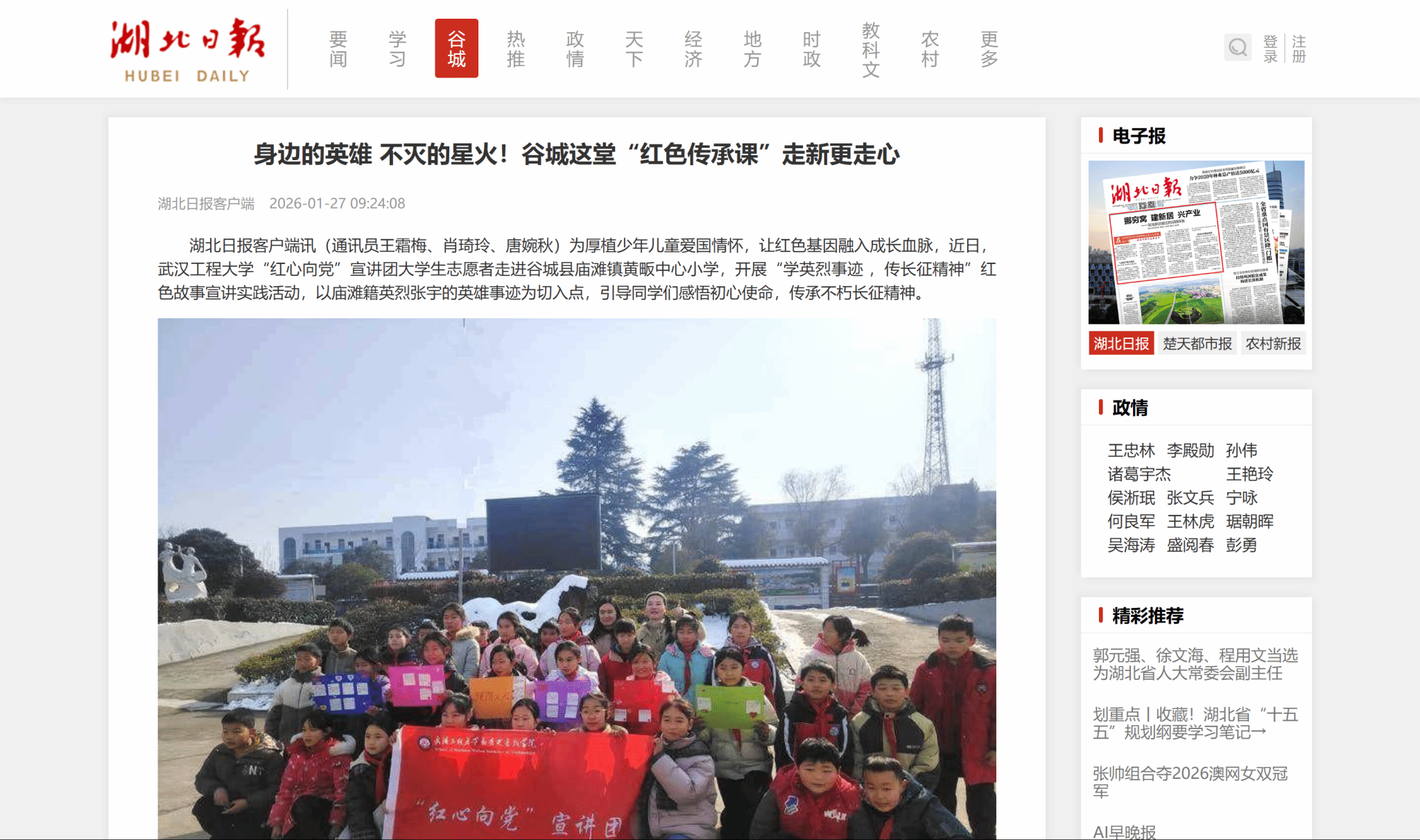 湖北日报客户端讯(通讯员王霜梅、肖琦玲、唐婉秋)为厚植少年儿童爱国情怀,让红色基因融入成长血脉,近日,武汉工程大学“红心向党”宣讲团大学生志愿者走进谷城县庙滩镇黄畈中心小学,开展“学英烈事迹 ,传长征精神”红色故事宣讲实践活动,以庙滩籍英烈张宇的英雄事迹为切入点,引导同学们感悟初心使命,传承不朽长征精神。