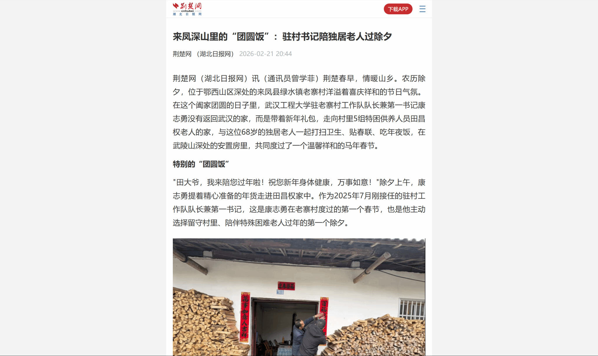 荆楚网(湖北日报网)讯(通讯员曾学菲)荆楚春早,情暖山乡。农历除夕,位于鄂西山区深处的来凤县绿水镇老寨村洋溢着喜庆祥和的节日气氛。在这个阖家团圆的日子里,武汉工程大学驻老寨村工作队队长兼第一书记康志勇没有返回武汉的家,而是带着新年礼包,走向村里5组特困供养人员田昌权老人的家,与这位68岁的独居老人一起打扫卫生、贴春联、吃年夜饭,在武陵山深处的安置房里,共同度过了一个温馨祥和的马年春节。