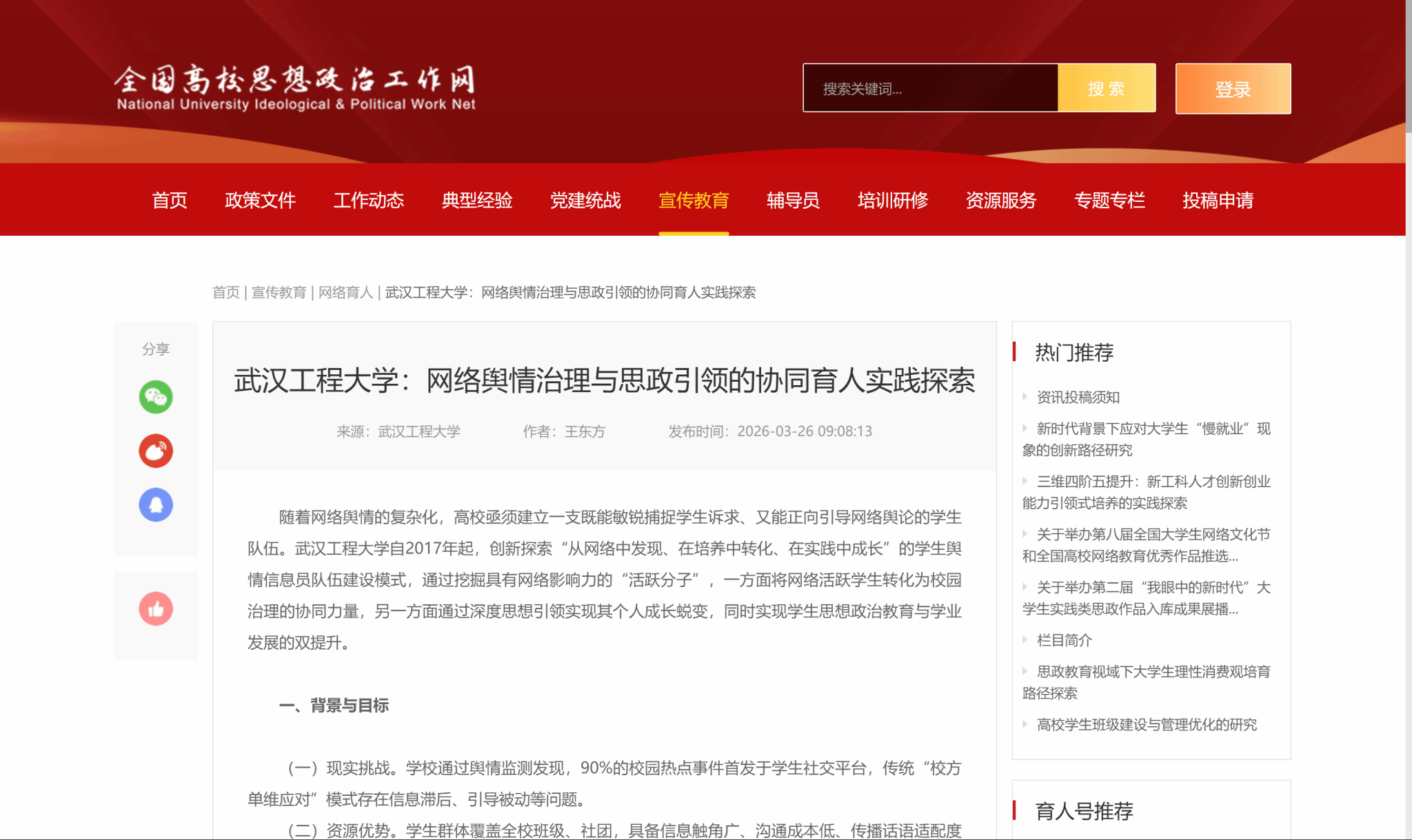 随着网络舆情的复杂化,高校亟须建立一支既能敏锐捕捉学生诉求、又能正向引导网络舆论的学生队伍。武汉工程大学自2017年起,创新探索“从网络中发现、在培养中转化、在实践中成长”的学生舆情信息员队伍建设模式,通过挖掘具有网络影响力的“活跃分子”,一方面将网络活跃学生转化为校园治理的协同力量,另一方面通过深度思想引领实现其个人成长蜕变,同时实现学生思想政治教育与学业发展的双提升。
