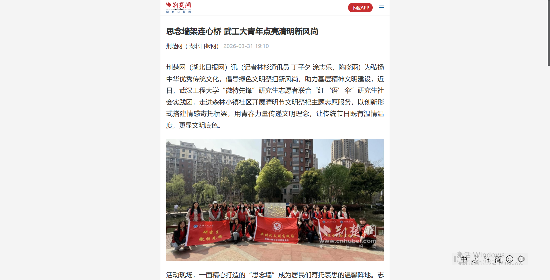 一面思念墙寄哀思,一份倡议文书新风。活动相关负责人表示,活动既传承了清明佳节慎终追远的文化内涵,又以青春创新之举推动了文明新风在基层落地生根,获得了社区居民的一致好评。下一步,武汉工程大学将持续组织青年学子开展各类志愿服务与文明实践活动,让青春力量扎根基层,为助力湖北精神文明建设、构建和谐美好社区贡献更多高校智慧与青年力量。