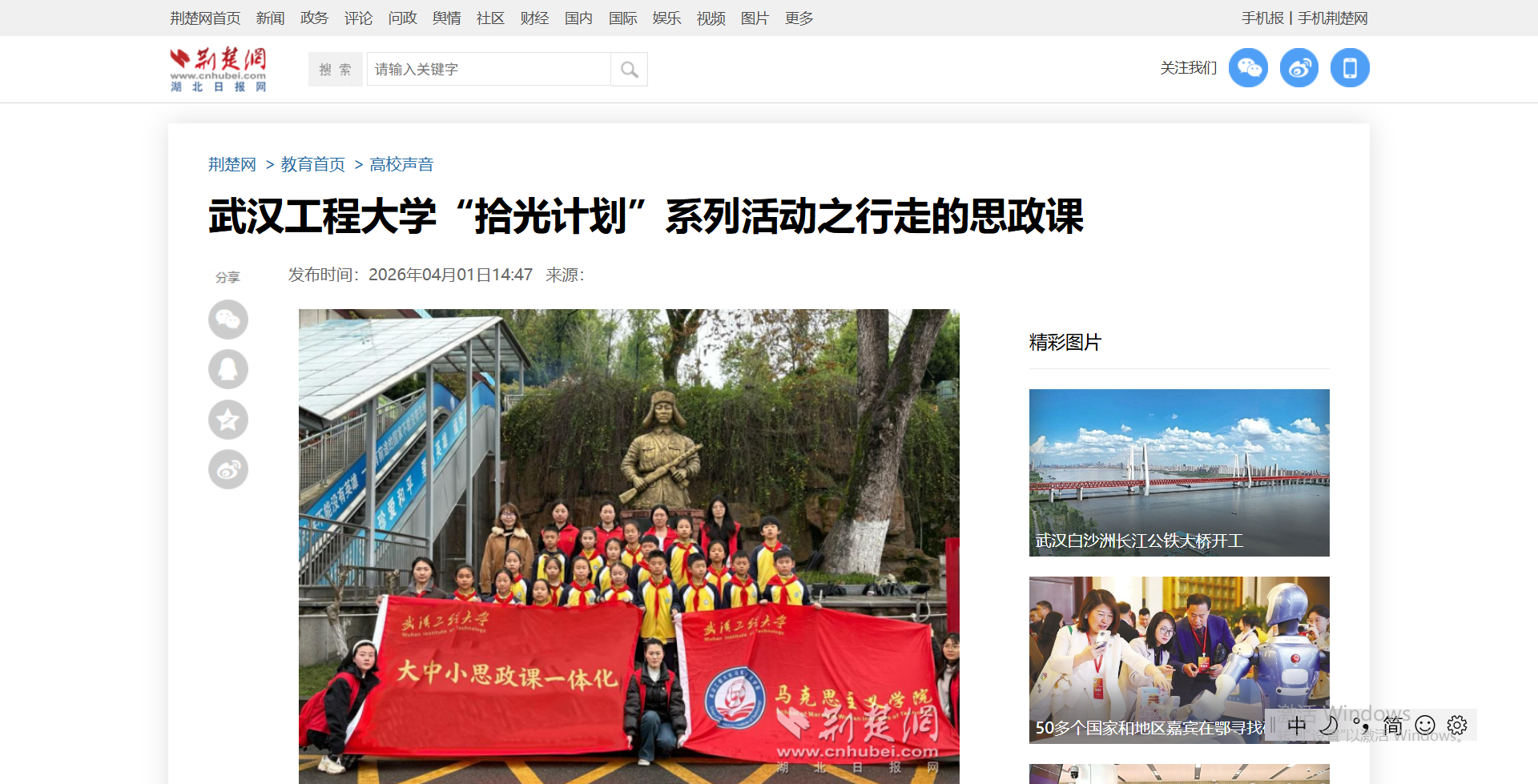 荆楚网(湖北日报网)讯(记者许文秀 通讯员 李诗佳)为深入推进学院“拾光计划”思政课成果展进一步丰富,深入推进大中小学思政课建设一体化,3月30日下午,由武汉工程大学马克思主义学院牵头,联合光谷第二小学举办的大中小学思政课一体化“清明祭英烈·心语寄忠魂”祭扫活动在武汉市九峰山烈士陵园庄严举行。作为武汉工程大学马克思主义学院重点打造的思政育人品牌“拾光计划.身边的红色故事”系列活动之一,本次活动汇聚30余名学生代表及带队教师,在英烈长眠之地,共上一堂“行走的思政课”。