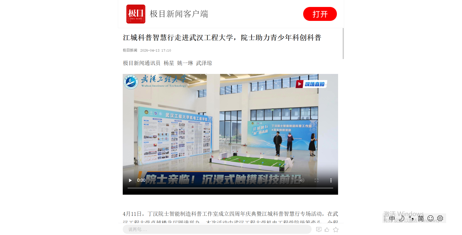 4月11日,丁汉院士智能制造科普工作室成立四周年庆典暨江城科普智慧行专场活动,在武汉工程大学卓越楼北厅圆满举办。本次活动由武汉工程大学机电工程学院统筹牵头、全程组织实施,锚定智能制造科普核心方向,聚焦青少年科技创新后备人才培育,以“沉浸式实操+竞技化体验+专业化引领”为核心模式,搭建起高端科创资源与青少年科普教育对接的桥梁,武汉市南湖中学40名学生全程参与本次科普实践活动,多位智能制造领域院士专家亲临现场指导交流,为青少年科创成长领航赋能。