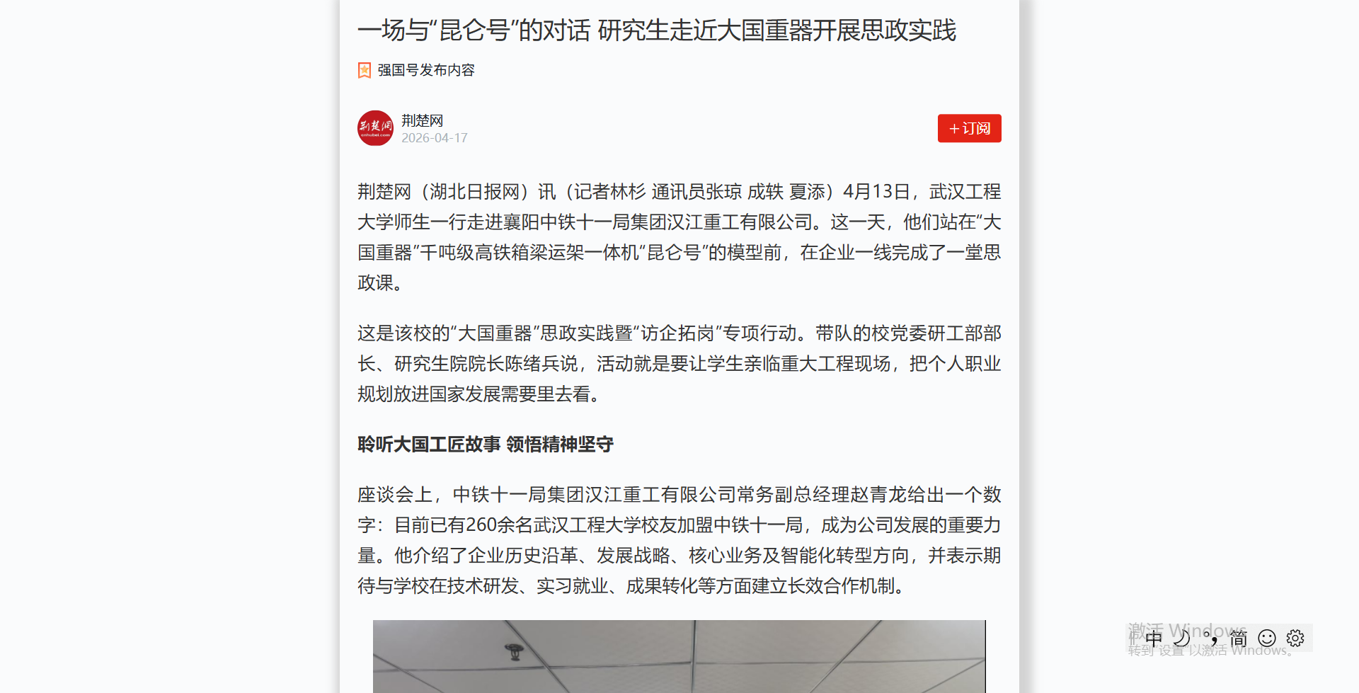 4月13日,武汉工程大学师生一行走进襄阳中铁十一局集团汉江重工有限公司。这一天,他们站在“大国重器”千吨级高铁箱梁运架一体机“昆仑号”的模型前,在企业一线完成了一堂思政课。