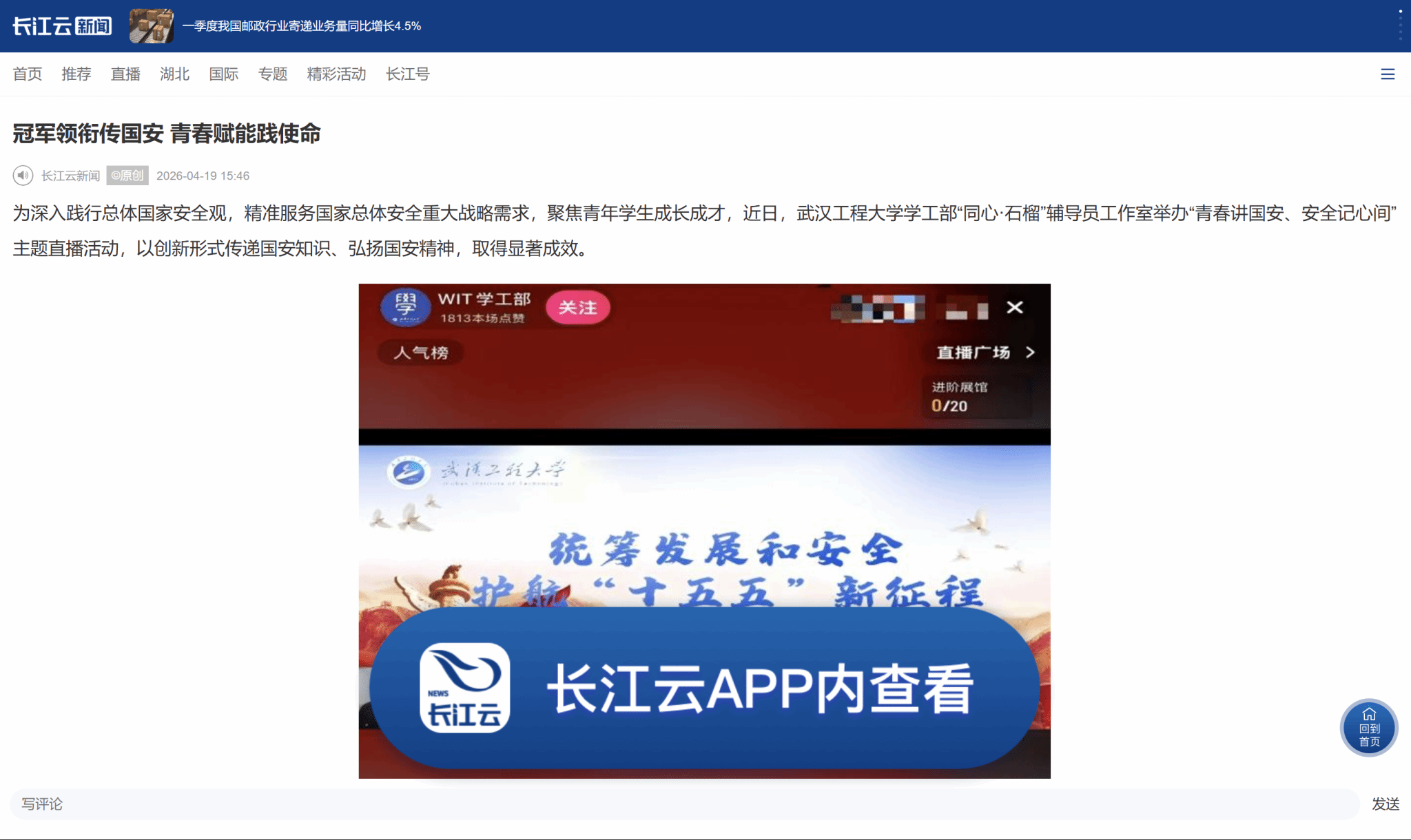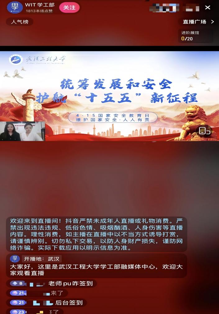 为深入践行总体国家安全观,精准服务国家总体安全重大战略需求,聚焦青年学生成长成才,近日,武汉工程大学学工部“同心·石榴”辅导员工作室举办“青春讲国安、安全记心间”主题直播活动,以创新形式传递国安知识、弘扬国安精神,取得显著成效。