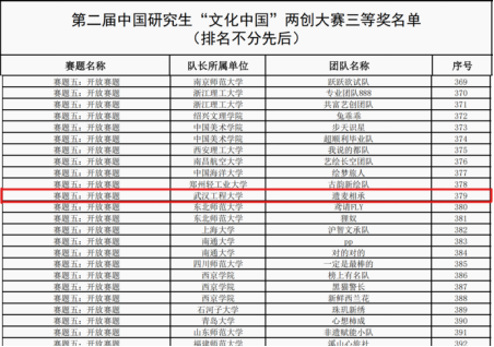 本网讯(通讯员 欧一珂)近日,在教育部学位管理与研究生教育司指导下,由中国学位与研究生教育学会、中国科协青少年科技中心主办的第二届中国研究生“文化中国”两创大赛正式举行并公布获奖名单。我院研究生郭可慧、欧一珂、张洋洋凭借作品《遗麦相承——非遗麦秆画的传承与创新》,在全国4589个参赛作品中脱颖而出,荣获国赛三等奖,展现了我院学子扎实的文化素养、卓越的创新能力和强烈的使命担当。