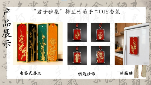 备赛过程中,团队成员通过查阅大量文献、走访地方文化馆、与非遗领域专家线上交流等方式,全面梳理麦秆画的历史渊源、制作工艺和文化内涵。基于扎实调研,项目精准定位多类目标群体,并围绕“场景化实用设计”与“低门槛高上限”的参与模式进行创新,研发了一套集书签式屏风、冰箱贴、钥匙挂件等系列文创产品为一体的麦秆画手工DIY套装,让非遗艺术融入日常生活。