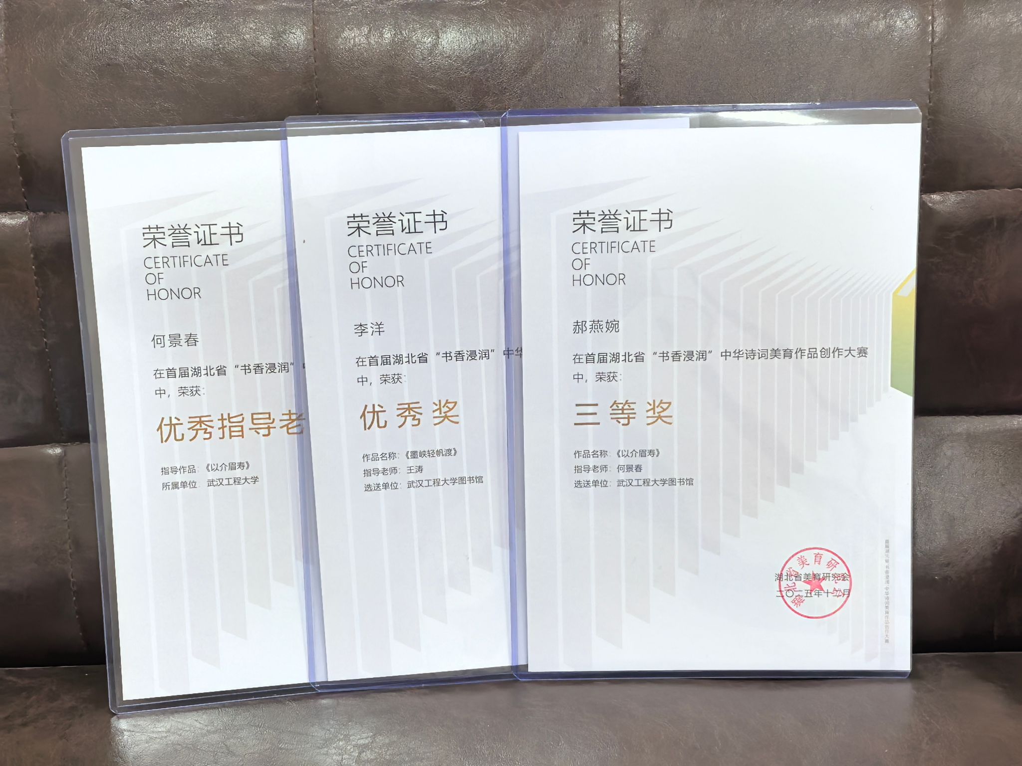 本网讯(通讯员 苗苑)近日,首届湖北省“书香浸润”中华诗词美育作品创作大赛评审结果正式揭晓。我校获“优秀组织单位”,马克思主义学院郝燕婉同学的作品《以介眉寿》荣获三等奖,李洋同学的作品《墨峡轻帆渡》荣获优秀奖。此外,马院何景春老师获评“优秀指导老师”,图书馆赵春阳、熊洁、苗苑三位老师获评“优秀组织个人”。