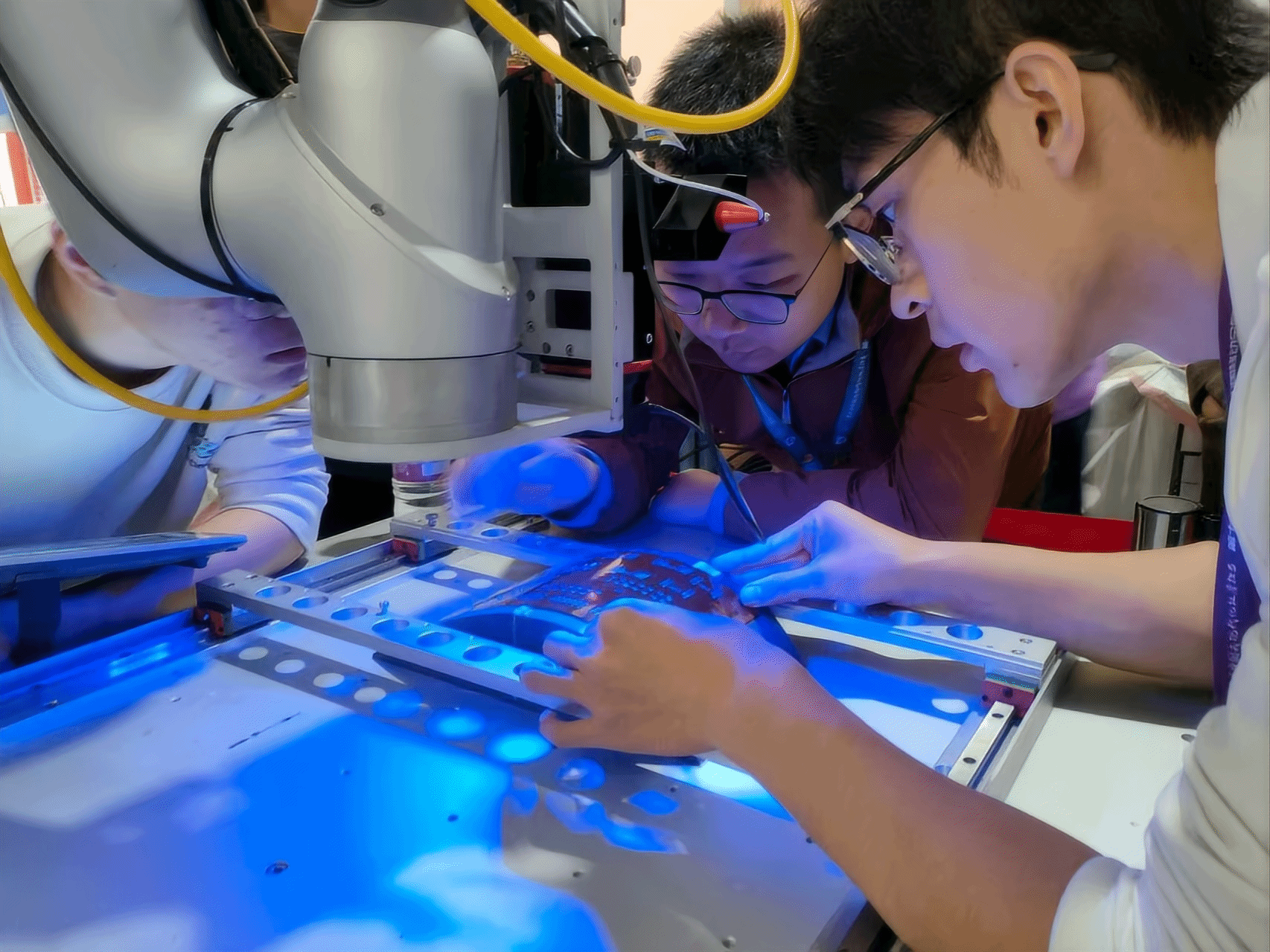 创新创业学院老师张聪与项目负责人李国豪牵头攻坚这一难题。他们面临的首要障碍是坐标获取的精度问题——如何确保每个焊点的位置和角度都能达到工艺要求,保证焊接牢固度。在张聪的全程指导下,经过近450天的持续研发,进行了数千次曲面焊点测试,团队最终突破了这一技术瓶颈。