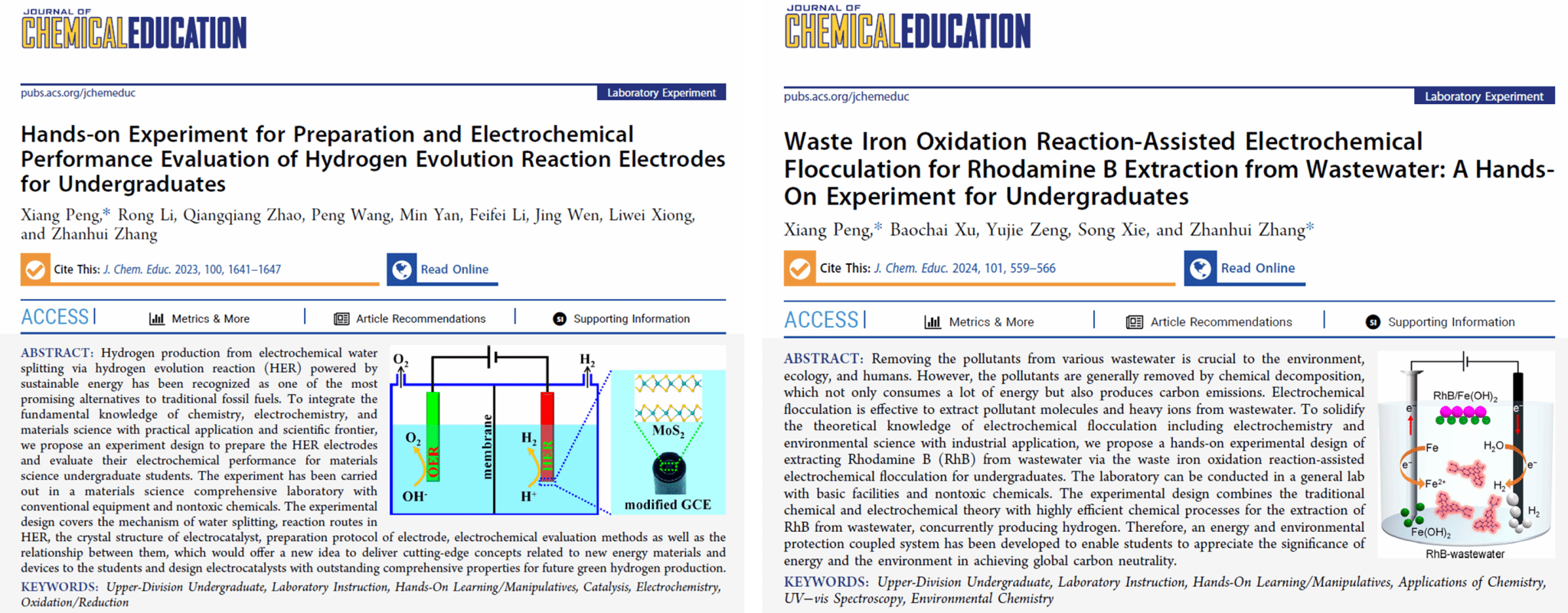 他还将在化学教育领域国际著名期刊《Journal of Chemical Education》发表的关于析氢反应电极制备、废水染料电絮凝提取、稀土离子电化学等3篇教研论文,提取为科研场景、转化为本科生实验项目。这些项目不仅让学生掌握了基本实验技能,更让他们在本科阶段就接触到真实的科研问题,培养了科学思维和创新能力。科研真正走进了课堂,赋能了教学。