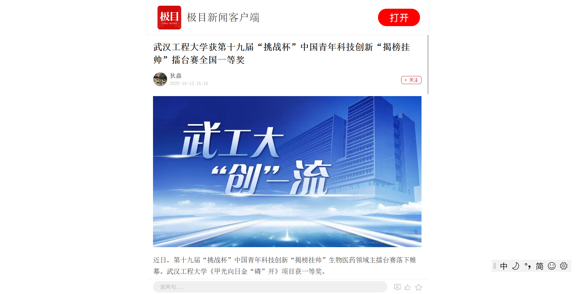 近日,第十九届“挑战杯”中国青年科技创新“揭榜挂帅”生物医药领域主擂台赛落下帷幕。武汉工程大学《甲光向日金“磷”开》项目获一等奖。