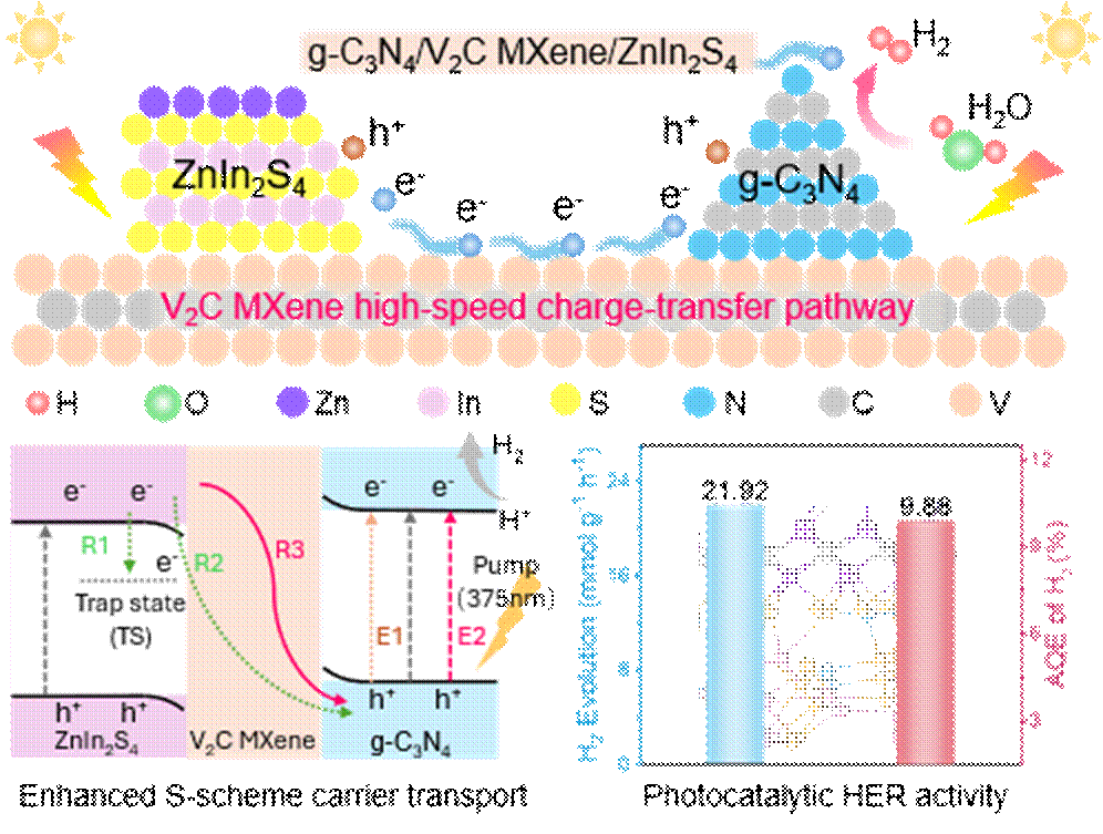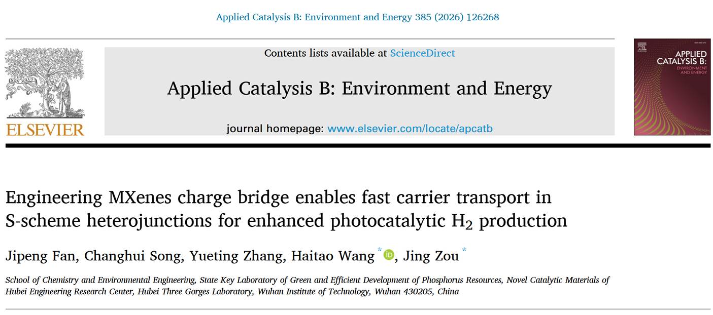本网讯(通讯员 程然)近日,我校化学与环境工程学院催化与固废协同创新团队在国际知名期刊Applied Catalysis B: Environment and Energy(IF=21.2,中科院一区TOP)上发表题为“Engineering MXenes charge bridge enables fast carrier transport in S-scheme heterojunctions for enhanced photocatalytic H2 production”的最新研究成果。武汉工程大学化学与环境工程学院为论文唯一署名单位,2025级博士研究生凡纪鹏为论文第一作者,王海涛副教授与邹菁教授为该论文共同通讯作者。
