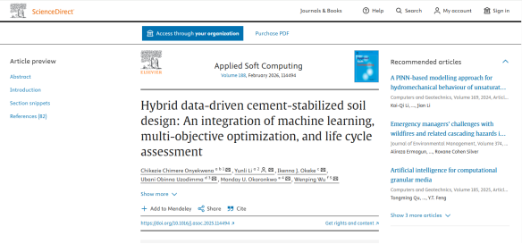本网讯(通讯员 刘建章)近日,武汉工程大学研究设计院博士后科研工作站传出喜讯:在站博士后Chikezie Chimere Onyekwena以第一作者身份,在计算机科学与工程技术领域的国际知名学术期刊《Applied Soft Computing》发表研究论文“Hybrid data-driven cement-stabilized soil design: An integration of machine learning, multi-objective optimization, and life cycle assessment”。论文通讯作者为合作导师武汉工程大学李云丽教授。该论文的发表是工作站在高层次人才培养与科研创新融合方面取得的又一标志性成果。