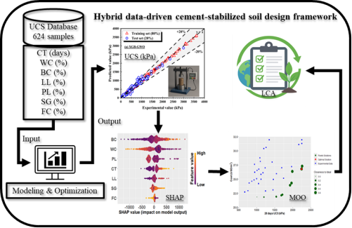 Chikezie博士后的论文聚焦于水泥固化土配合比设计难题,在综合了机器学习、多目标优化与生命周期评估等方法的基础上,提出了混合数据驱动框架,通过对水泥加固软土生命周期的评估,实现了强度预测、配合比优化及环境影响的评估,有效解决了传统方法设计周期长、成本高、多目标难以兼顾的问题。研究成果表明,优化方案可使固化土强度提升约66%,材料成本与碳排放量均降低约16%,为“双碳”战略下的土壤稳定提供了可持续、可扩展的技术支持。该成果的发表,不仅体现了博士后个人卓越的科研能力,更彰显了工作站在工程技术研究与人才赋能方面的平台价值。