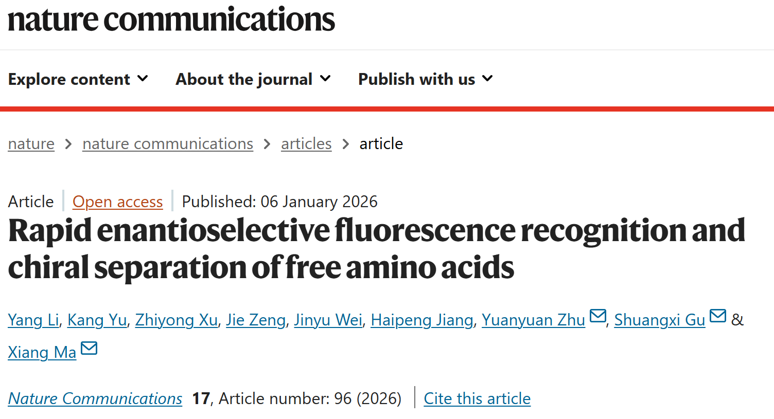本网讯(通讯员 杨公明 龙姣)近日,我校化工与制药学院古双喜教授研究团队在国际著名期刊《Nature Communications》上发表题为“Rapid enantioselective fluorescence recognition and chiral separation of free amino acids”的研究论文。武汉工程大学为第一单位,化工与制药学院李扬副教授、2024届硕士毕业生余康、2023级博士生许志勇为论文共同第一作者,化学与环境工程学院朱园园教授、化工与制药学院古双喜教授和华东理工大学马骧教授为论文共同通讯作者。