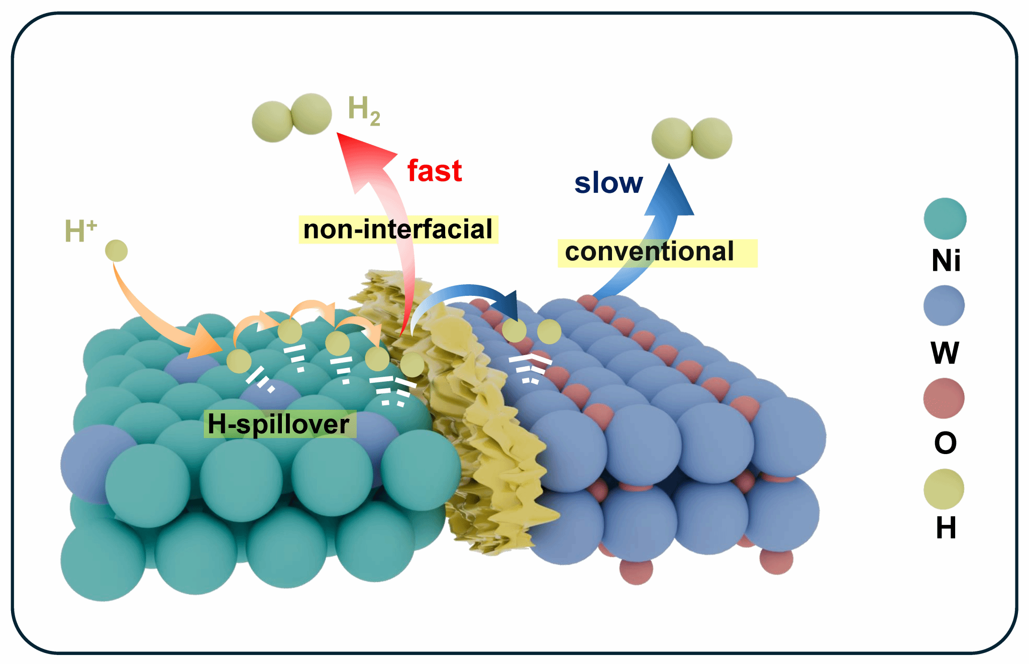 随着全球对可持续能源需求的日益迫切,绿色氢能成为实现碳中和目标的关键载体。质子交换膜电解水制氢技术因其高效、响应快等优势备受关注。然而,该技术高度依赖稀缺昂贵的铂族金属催化剂,严重制约了其大规模工业应用。非贵金属催化剂虽成本低廉,却普遍存在一个难以逾越的“氢吸附-脱附”悖论:它们对氢的吸附过强,导致产物氢气难以脱附,反应动力学迟缓。氢溢流效应被视为破解这一瓶颈的有效策略,但传统溢流机制依赖氢原子跨越不同物相界面传递,界面处存在的电子势垒与结构不稳定性,始终制约着催化效率的提升。