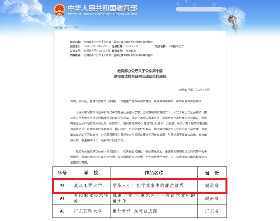本网讯(通讯员 章文杰)近日,教育部思想政治工作司公布第十届高校廉洁教育系列活动评选结果,经自主申报、省教育厅审核把关及专家评审等多环节严格遴选,我校选送的作品《结晶人生:化学意象中的廉洁哲思》成功入选“话廉修德”征文类优秀作品名单。